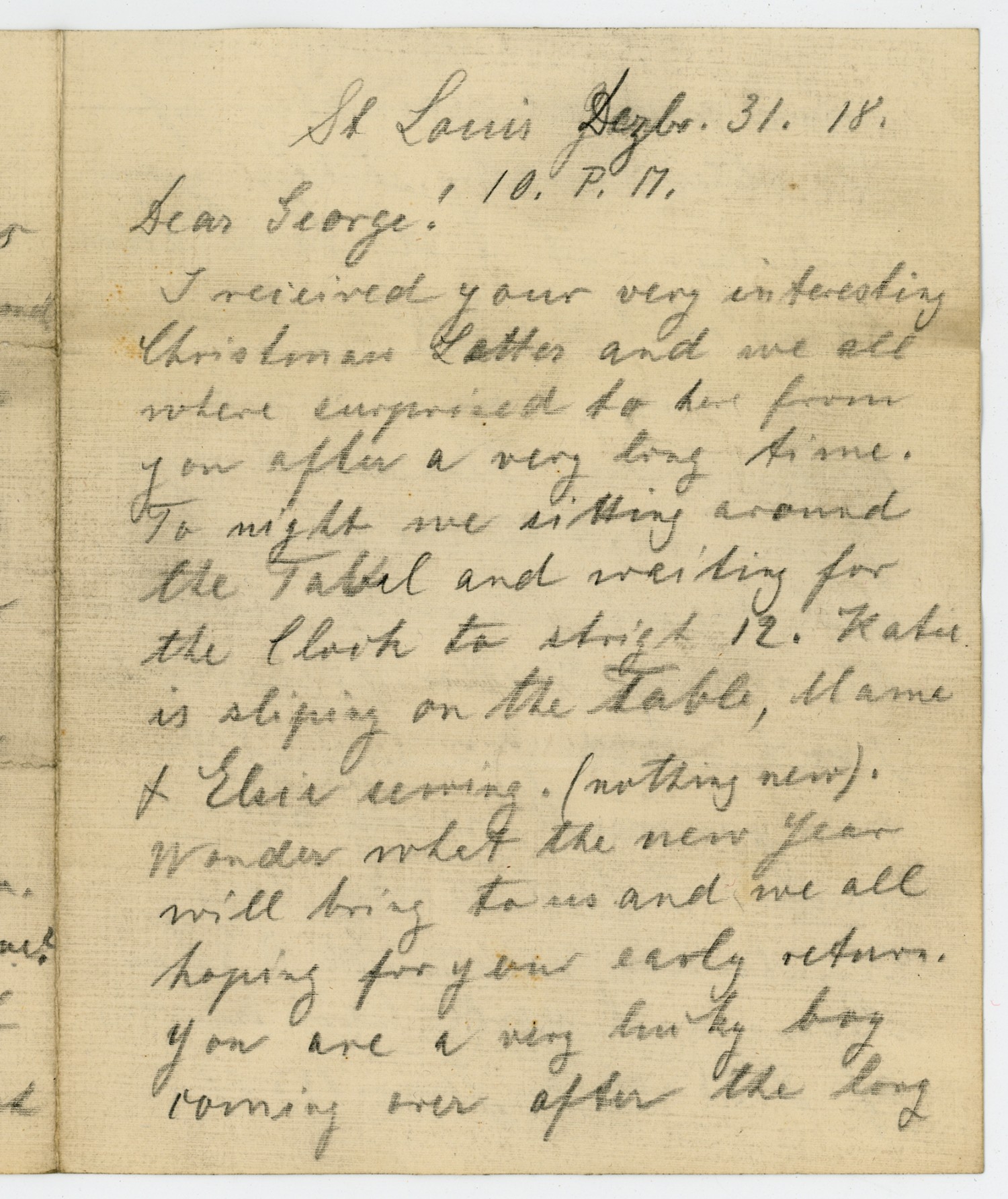 St. Louis [December] 31, [1918] 10. P.M. Dear George! I received your very interesting Christmas Letter and we all where surprised to here from you after a very long time. Tonight we sitting around the Tabel and waiting for the Clock to strigt 12. Katie is sliping on the Table, Mama & Elsie coming. (nothing new). Wonder what the new year will bring to us and we all hoping for your early return. You are a very lucky boy coming over after the long