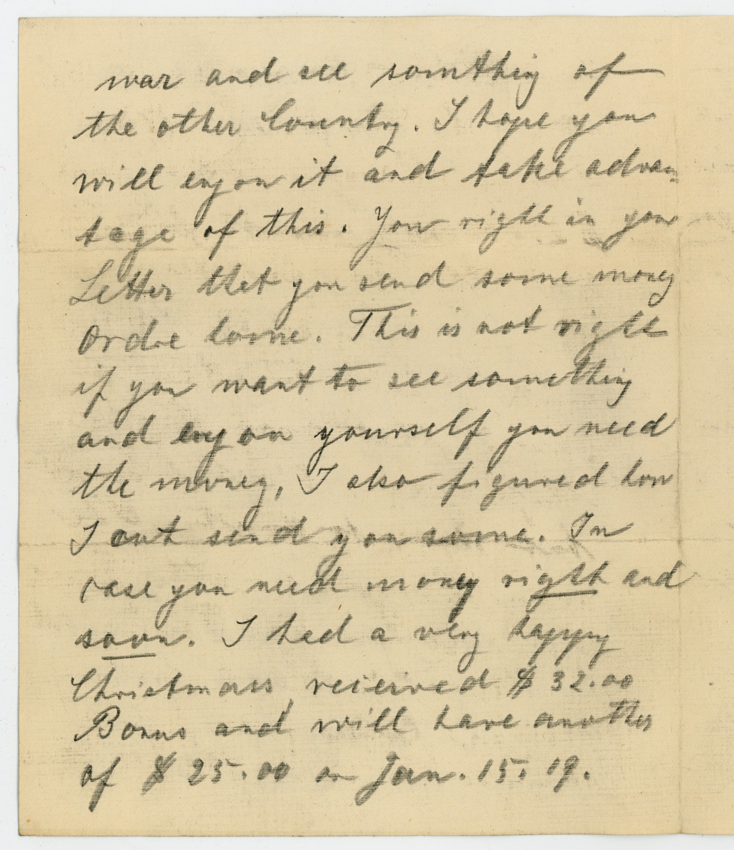 war and all somthing of the other Country. I hope you will enjoy it and take advantage of this. Your right in your Letter that you send some money order to me. This is not right if you want to see something and buy on yourself you need the money. I also figured how I out send you some. In case you need money right and soon. I had a very happy Christmas received $32.00 Bonus and will have another of $25.00 on [January] 15, [1918]