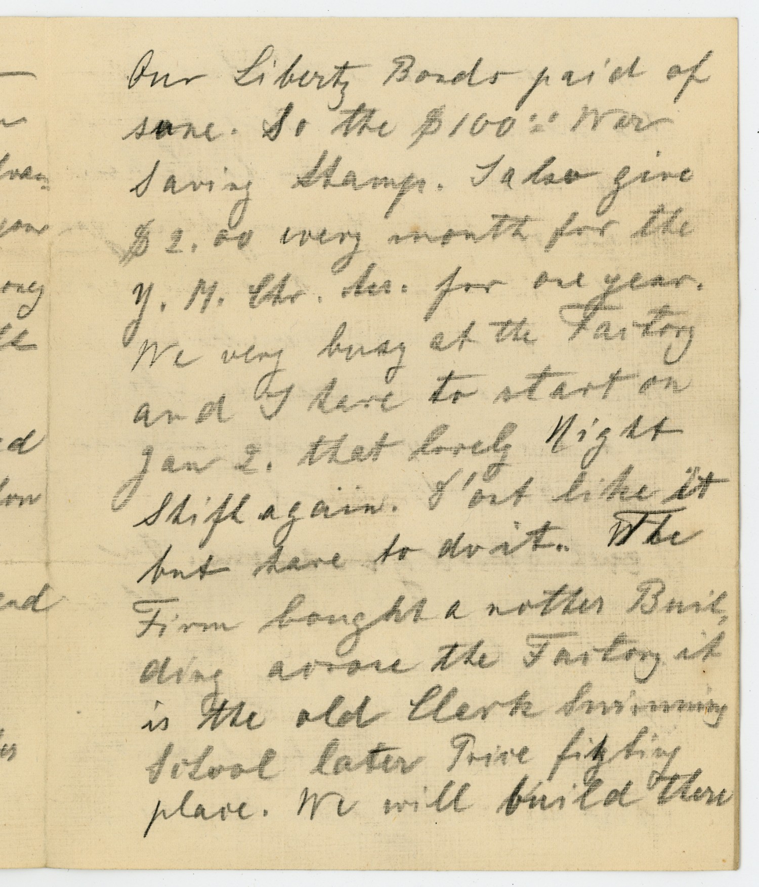 but Liberty Bonds paid of same. So the $100.00 [November] Saving Stamp. I also give $2.00 every month for the Y.M.C.A. [ms illegible: 1 wd] for one year. We are very busy at the Factory and I have to start on [January] 2, that lovely Night Shift again. I ont like it but have to do it. The Firm bought another Building across the Factory it is the old Clerk Swimming School later [ms illegible: 1 wd] fighting place. We will build there