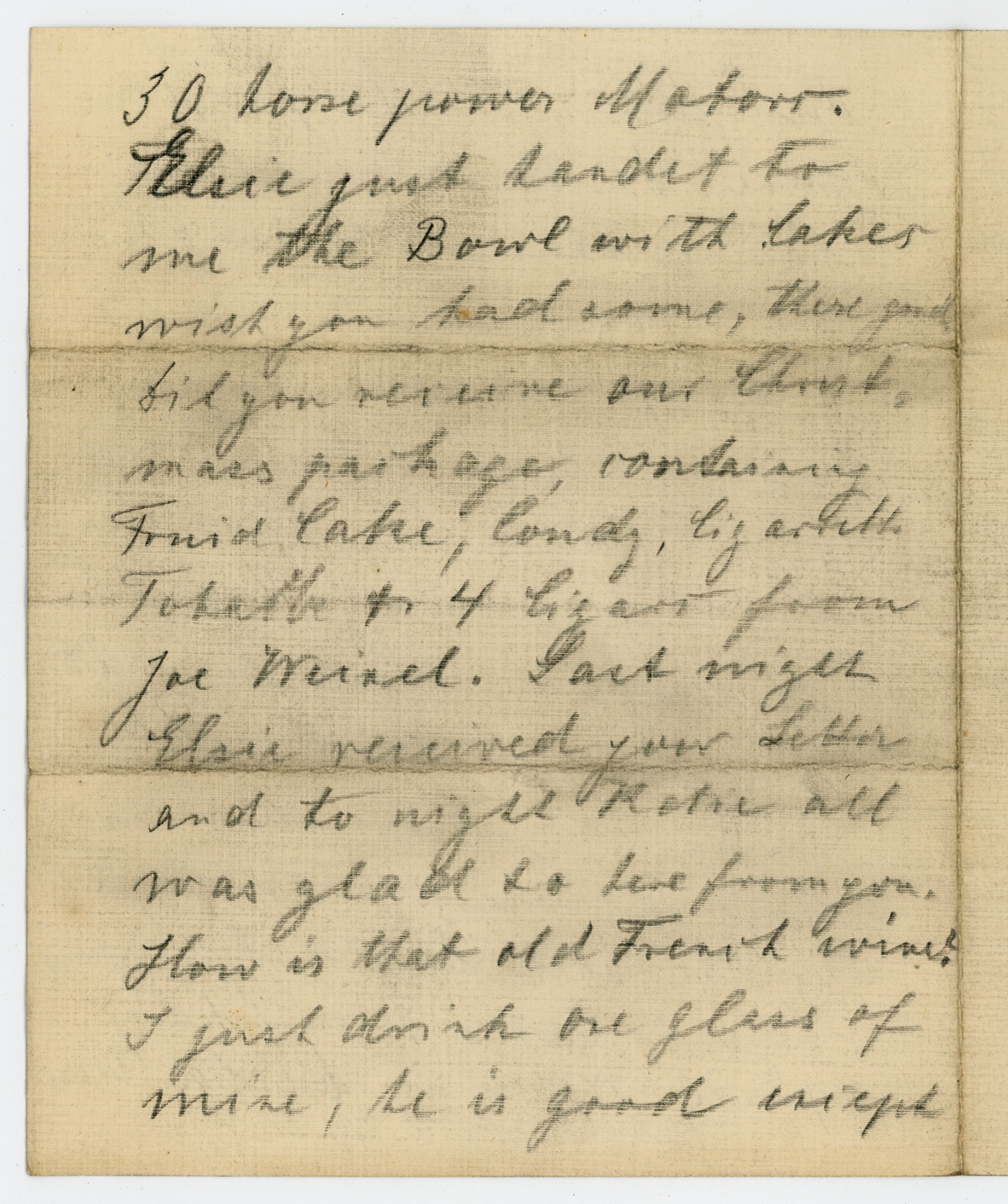 30 horse power Motor. Elsie just [ms illegible: 1 wd] the Bowl with lakes wish you had some, there good. Did you receive our Christmas package, containing Fruit Cake, Candy, cigarettes Tobacco & 4 Cigars from Joe Winsel. Last night Elsie received your Letter and tonight Katie all was glad to hear from you. How is that old French wine? I just drink one glass of wine, he is good except