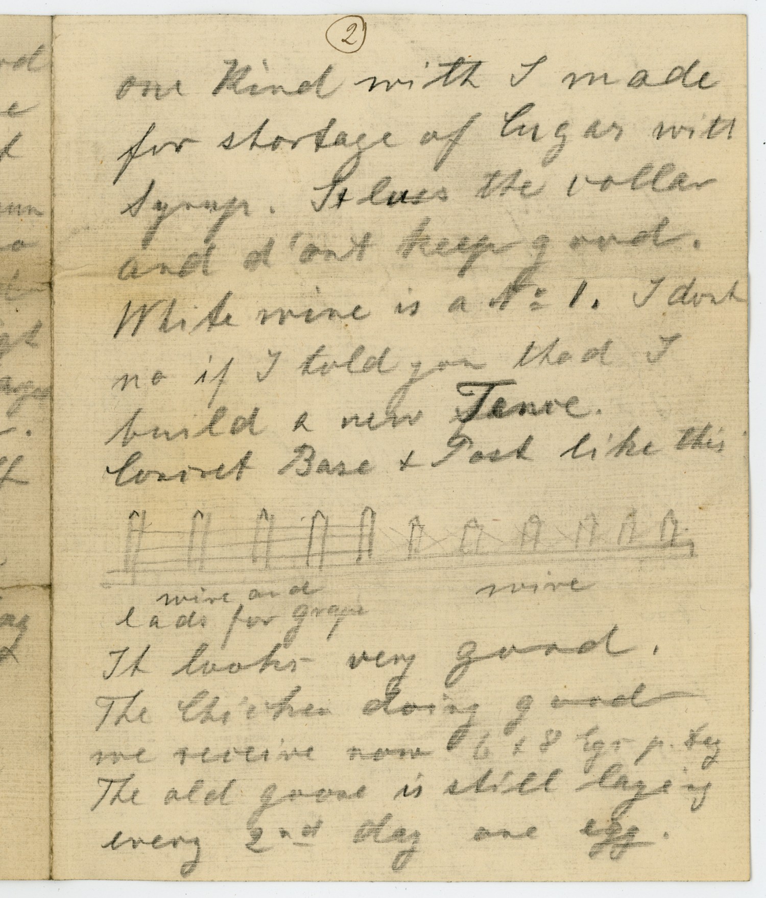 [page 2] our Kind with I made for shortage of Sugar with Syrup. It [ms illegible: 1 wd] the vollar and dont keep good. White wine is a No 1. I dont no if I told you that I build a new Fence. [ms illegible: 1 wd] Base & Post like this [sketch of fence] wine and lads for grape wine It looks very good. The Chicken doing good me receive now 6 & 8 Eggs p. day The old goose is still laying every 2nd day one egg