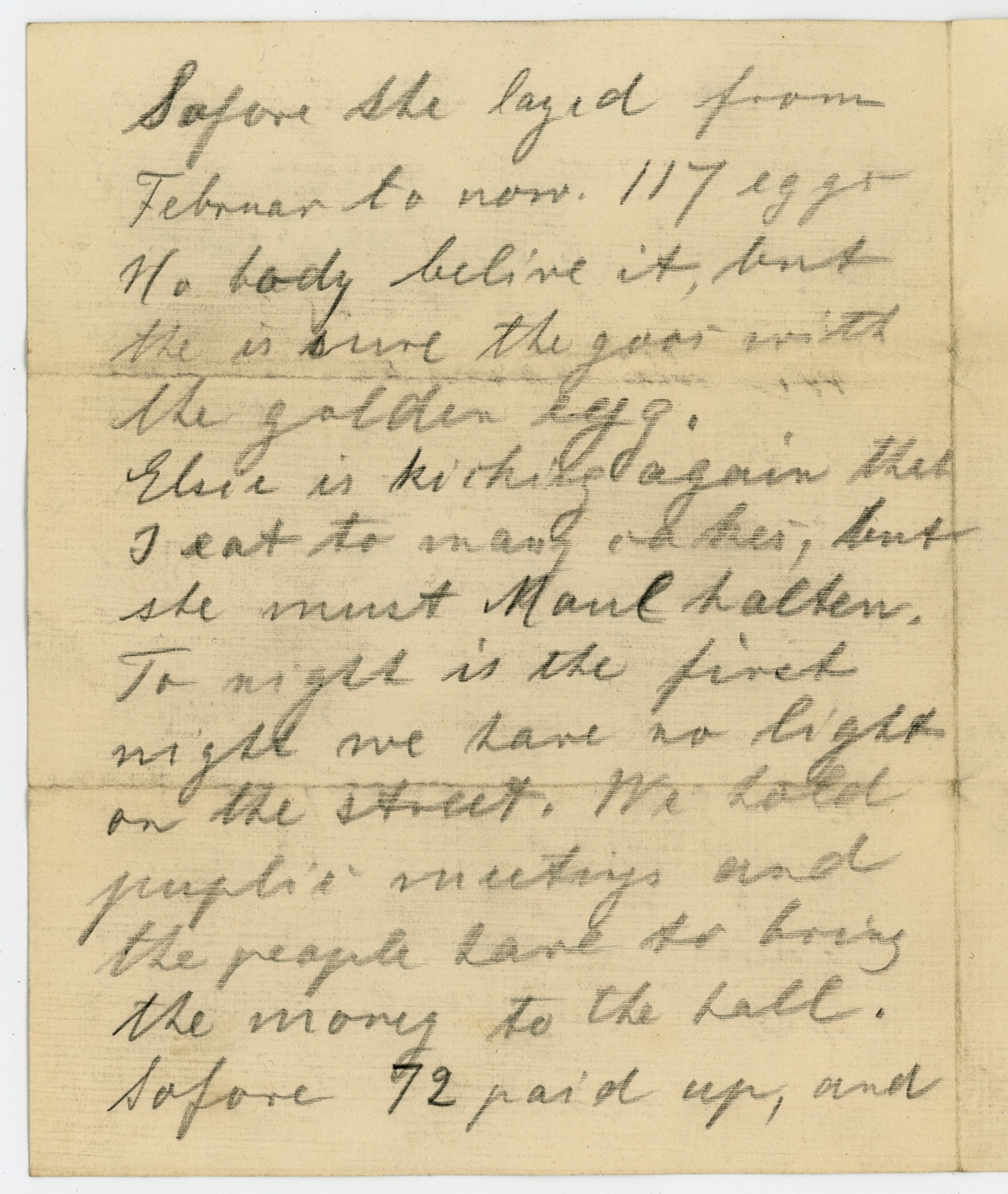 Before she layed from [February] to now. 117 eggs No body belive it, but the is sure the goos with the golden egg. Elsie is kicking again that I eat to many cakes, but she must [ms illegible: 2 wds]. To night is the first night we have no light on the street. We hold public meetings and the people love to bring the money to the hall. So fore 72 paid up, and