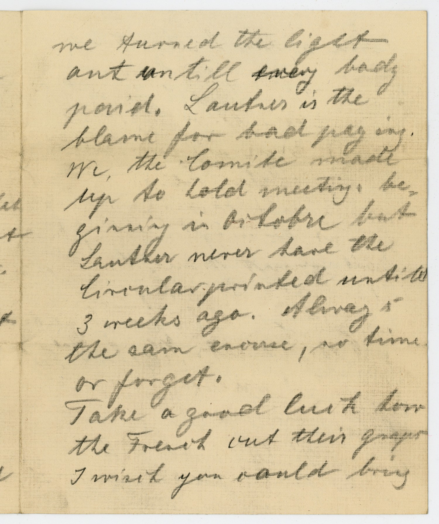 we turned the light out untill every body paid. Lautner is the blame for bad paying. We the Comite made up to hold meeting, beginning in as [ms illegible: 1 wd] but Lautner never have the binocular you asked untill 3 weeks ago. Always the same excuse, no time or forget. Take a good look how the French cut their grapes I wish you could bring