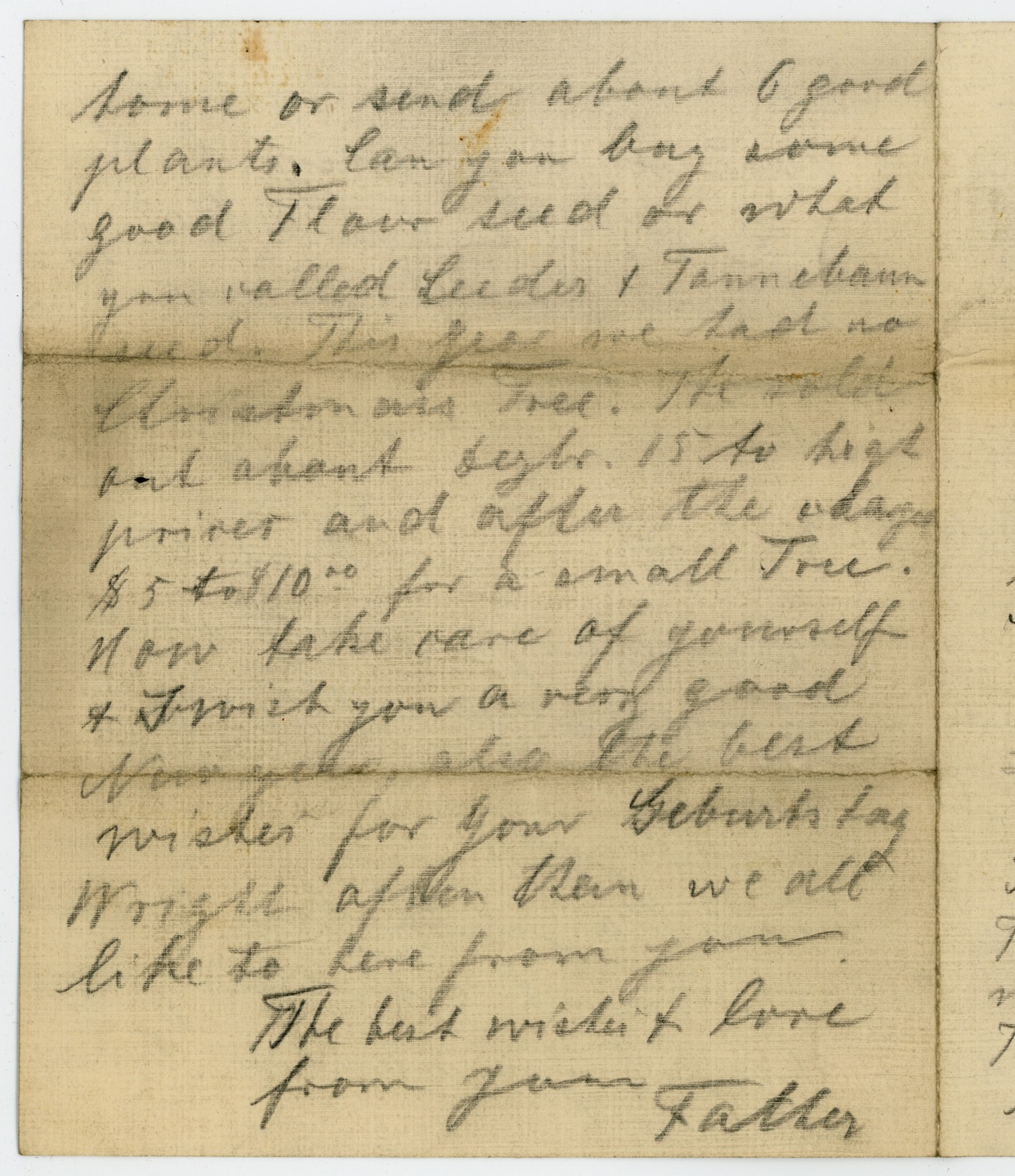 home or send about 6 good plants. Can you buy some good Flavor seed or what you called Leedes & Tannebam seed. This year we had no Christmas Tree. The sold out about before 15 so high prices and after the charges $5 to $10.00 for a small Tree. Now take care of yourself & I wish you a very good New year and the best wishes for your [ms illegible: 1 word] Wright often then we all like to here from you The best wishes & love from your Father