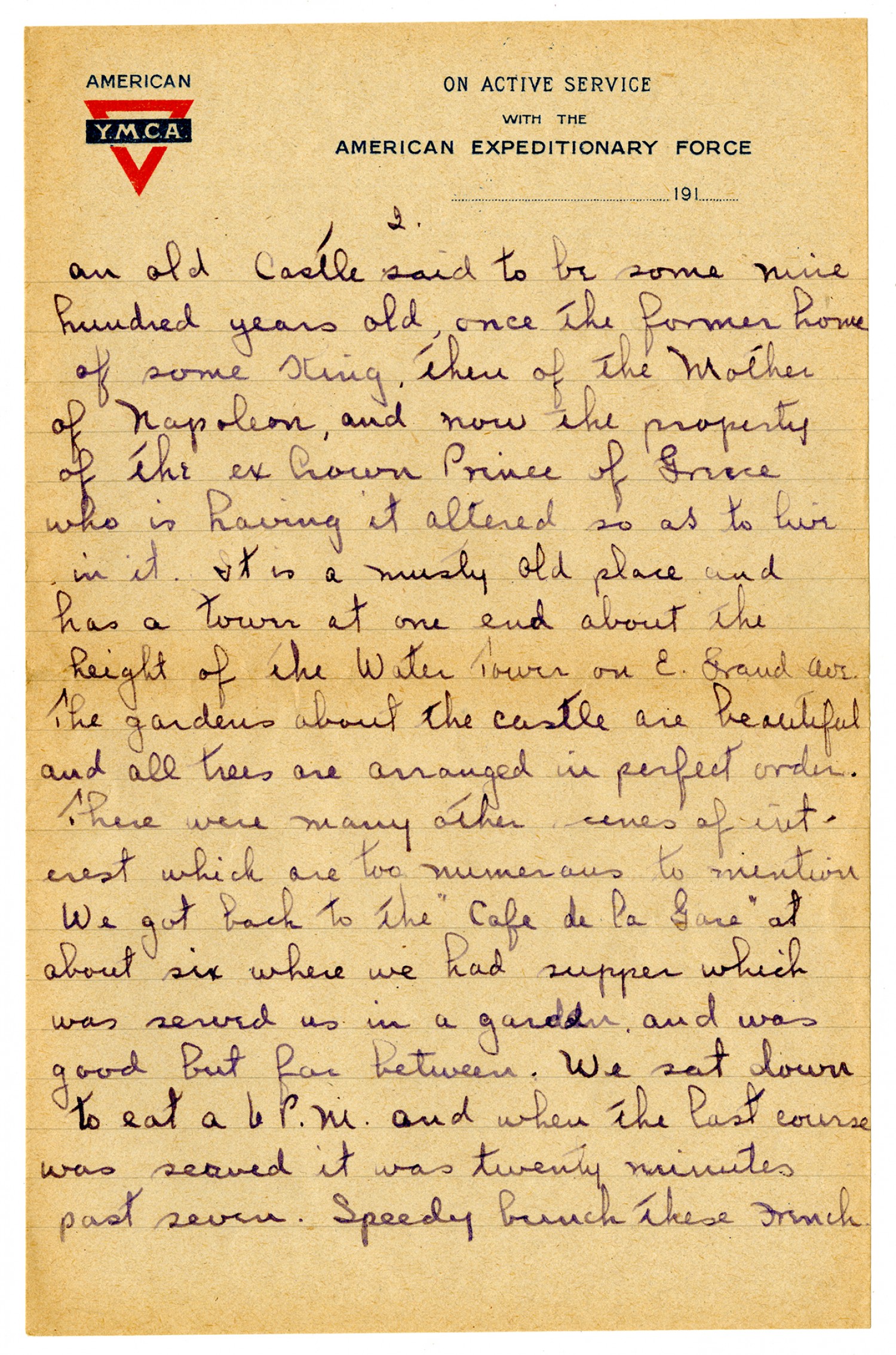 [page 2] [American Y.M.C.A. letterhead] an old Castle said to be some nine hundred years old, once the former home of some King. Then of the Mother of Napoleon, and now the property of the ex Crown Prince of Greece who is having it altered so as to live in it. It is a musty old place and has a town at one end about the height of the Water Tower on E. Grand Ave. The gardens about the castle are beautiful and all trees are arranged in perfect order. There were many other scenes of interest which are too numerous to mention We got back to the
