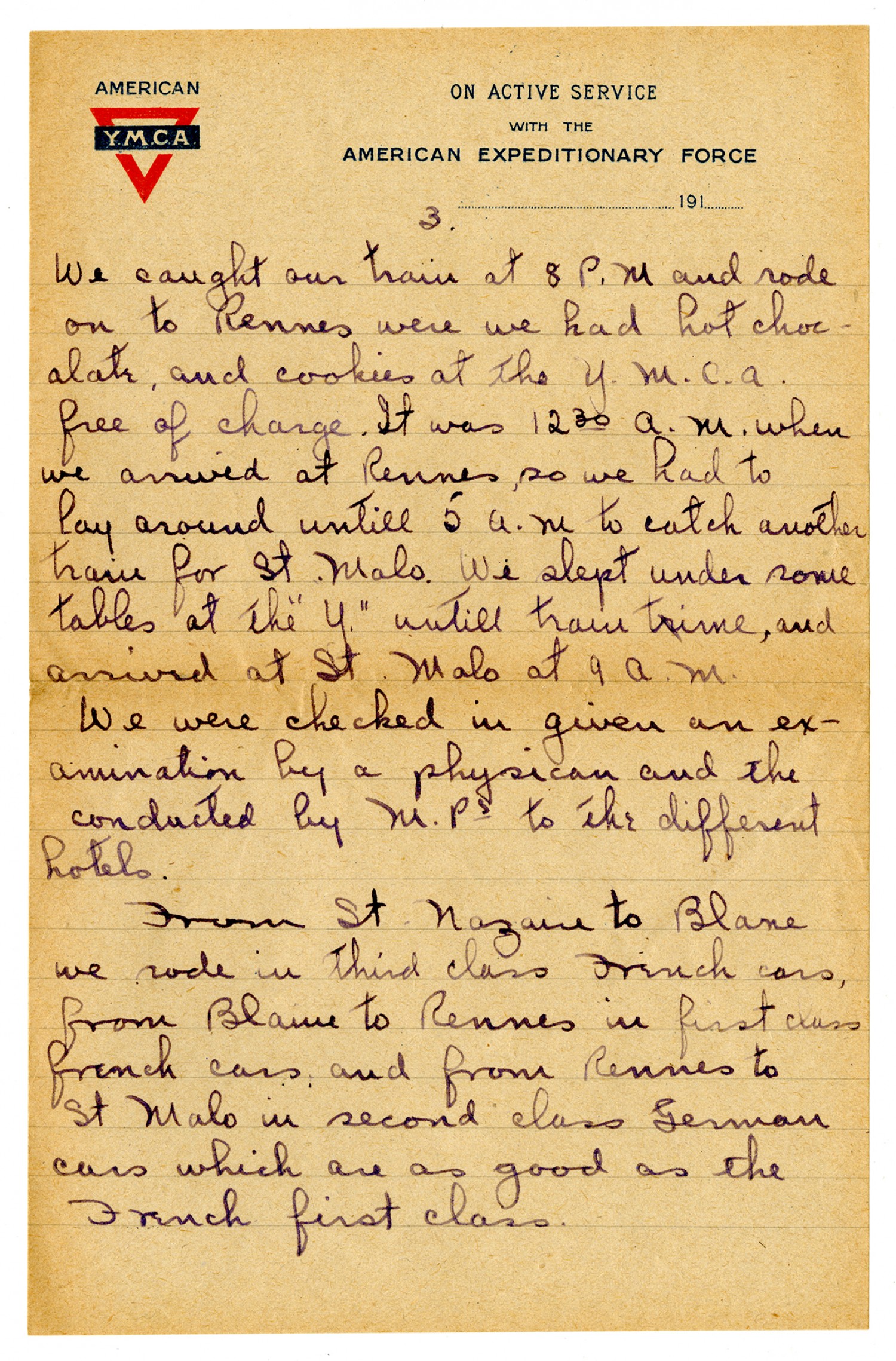 [page 3] [American Y.M.C.A. letterhead] We caught our train at 8 P.M and rode on to Rennes were we had hot chocolate, and cookies at the Y.M.C.A. free of charge. It was 1230 A.M. when we arrived at Rennes, so we had to lay around untill 5 A.M to catch another train for St. Malo. We slept under some tables at the