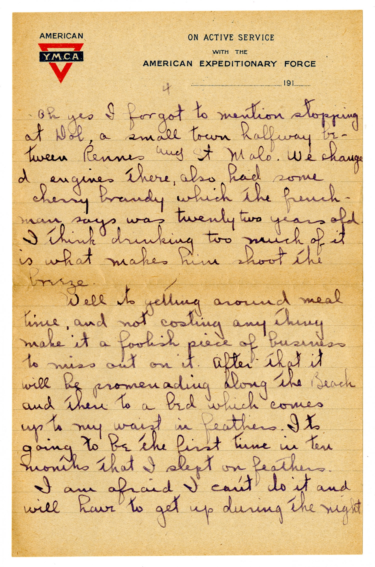 [page 4] [American Y.M.C.A. letterhead] oh yes I forgot to mention stopping at [Dol-de-Bretagner], a small town halfway between Rennes and St Malo. We changed engines there, also had some cherry brandy which the frenchman says was twenty two years old. I think drinking too much of it is what makes him shoot the breeze. Well its getting around meal time, and not costing any thing make it a foolish piece of business to miss out on it. After that it will be promenading along the Beach and then to a bed which comes up to my waist in feathers. Its going to bet the first time in ten months that I slept on feathers. I am afraid I can