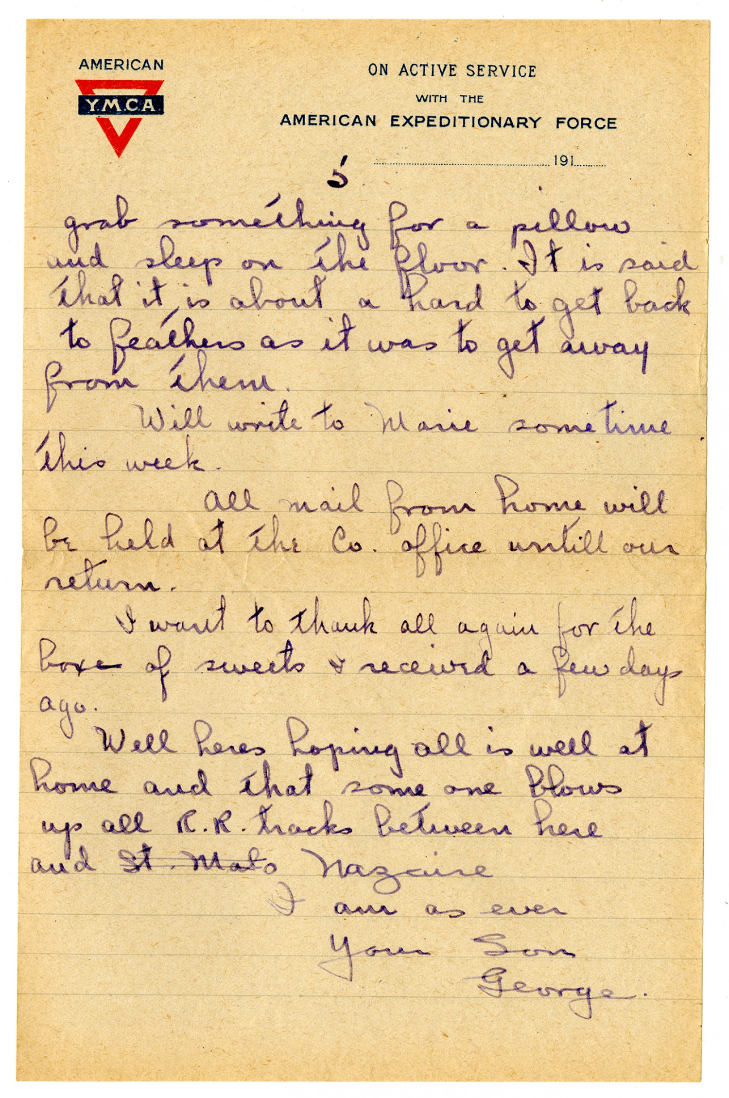 [page 5] [American Y.M.C.A. letterhead] grab something for a pillow and sleep on the floor. It is said that it is about a hard to get back to feathers as it was to get away from them. Will write to Marie sometime this week. All mail from home will be held at the Co. office untill our return. I want to thank all again for the box of sweets I received a few days ago. Well heres hoping all is well at home and that some one blows up all R.R. tracks between here and Nazaire I am as ever Your Son George.