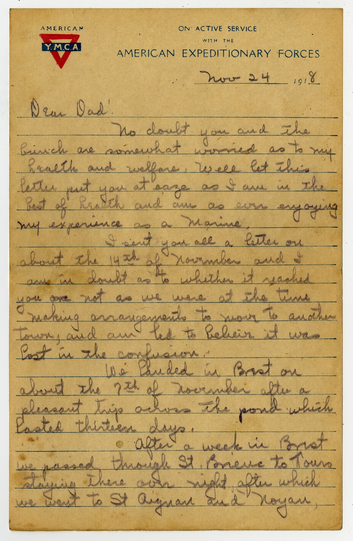 [American Y.M.C.A. letterhead][November 24, 1918] Dear Dad! No doubt you and the bunch are somewhat worried as to my health and welfare. Well let this letter put you at eaze as I am in the best of health and am as ever enjoying my experience as a Marine. I sent you all a letter on about the 14th of November and I am in doubt as to whether it reached you not as we were at the time making arrangements to move to another town, and am led to believe it was lost in the confusion. We landed in Brest on about the 7th of November after a pleasant trip across the pond which lasted thirteen days. After a week in Brest we passed through St. Briuc to Tours staying there over night, after which we went to St Aignon and Noyan,