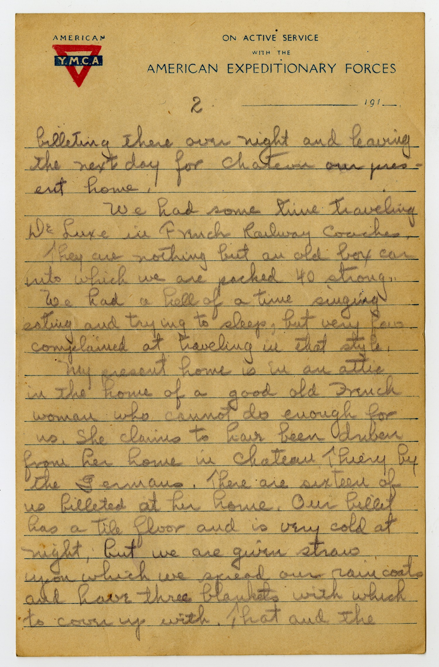 [page 2] [American Y.M.C.A. letterhead] billeting there over night and leaving the next day for Chateau our present home. We had some time traveling De Luxe in French Railway Coaches. They are nothing but an old box car into which we are packed 40 strong. We had a hell of a time singing eating and trying to sleep, but very few complained at traveling in that style. My present home is in an attic in the home of a good old French woman who cannot do enough for us. She claims to have been driven from her home in [Chateau Thierry] by the Germans. There are sixteen of us billeted at her home. Our billet has a tile floor and is very cold at night, but we are given straws. upon which we spread our rain coats and have three blankets with which to cover up with. That and the