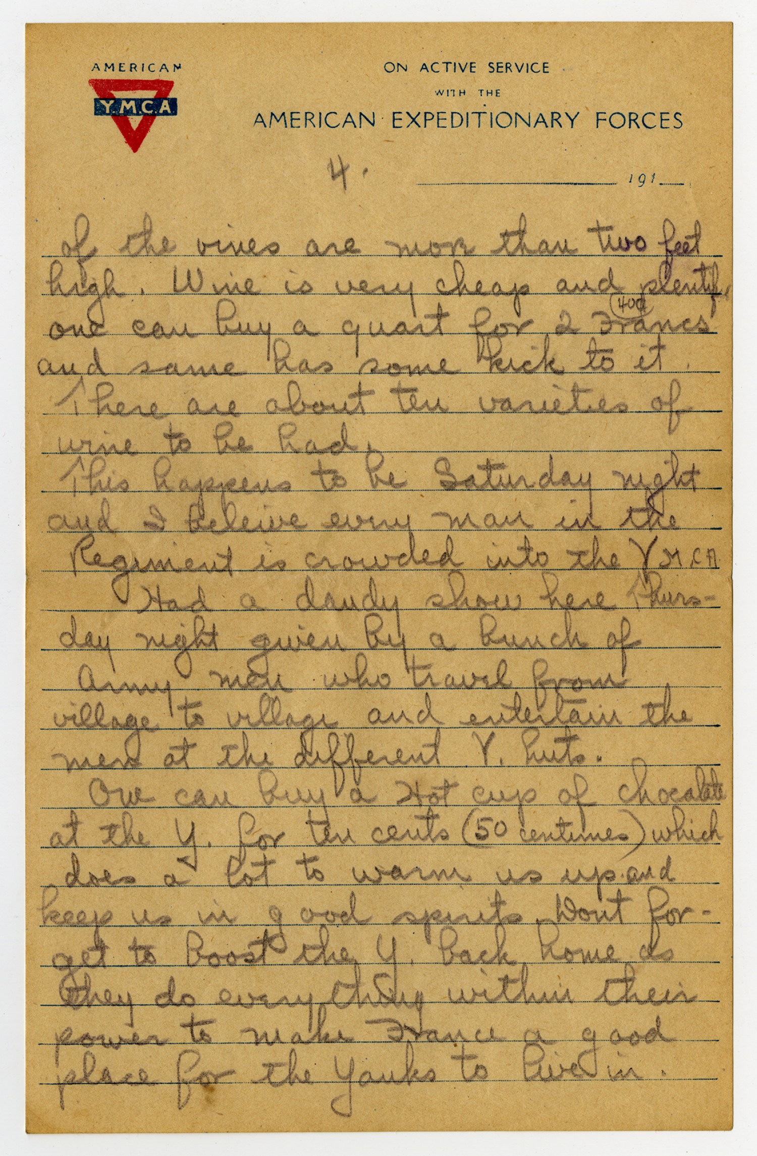 [page 4] [American Y.M.C.A. letterhead] of the vines are more than two feet high. Wine is very cheap and plentiful one can buy a quart for 2 Francs and some has some kick to it. There are about ten varieties of wine to be had. This happens to be Saturday night and I believe every man in the Regiment is crowded into the Y.M.C.A. Had a dandy show here Thursday night given by a bunch of Army men who travel from village to village and entertain the men at the different Y. huts. One can buy a Hot cup of chocolate at the Y. for ten cents (50 centimes) which does a lot to warm us up and keep us in good spirits. Dont forget to Boost the Y. back home as they do everything within their power to make France a good place for the Yanks to live in.