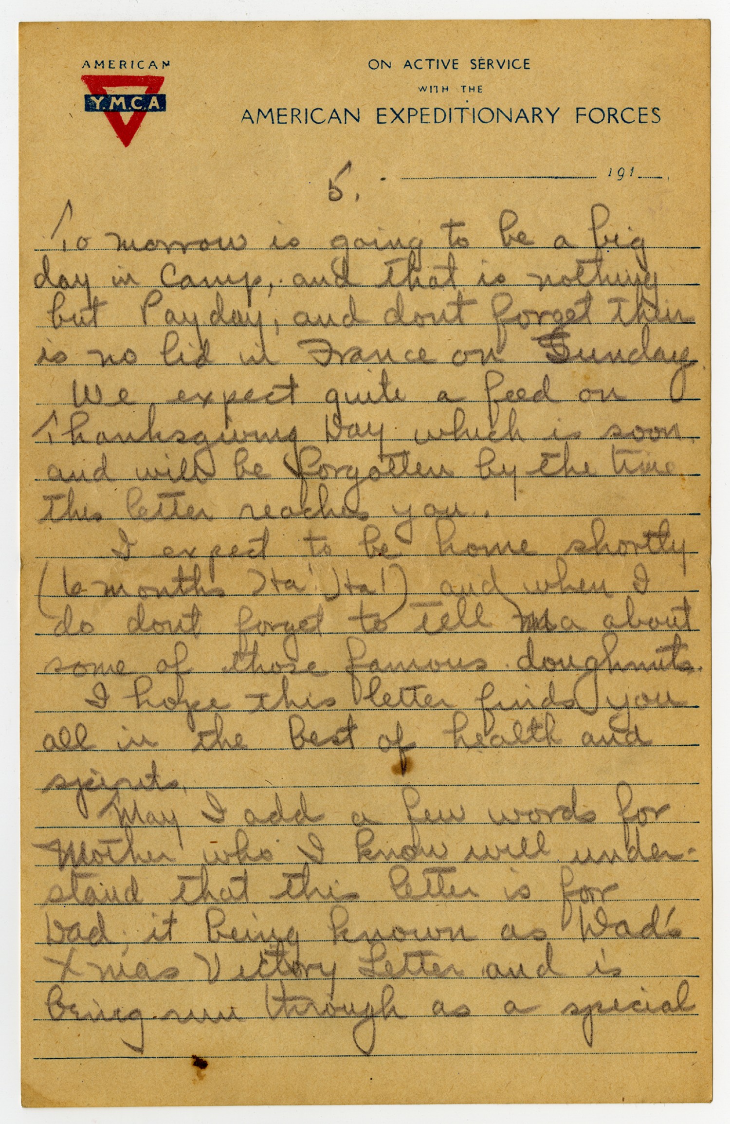 [page 5] [American Y.M.C.A. letterhead] Tomorrow is going to be a big day in camp, and that is nothing but Payday, and dont forget their is no lid in France on Sunday. We expect quite a feed on Thanksgiving Day which is soon and will be forgotten by the time this letter reaches you. I expect to be home shortly (6 months Ha! Ha!) and when I do dont forget to tell me about some of those famous doughnuts. I hope this letter finds you all in the best of health and spirits. May I add a few words for Mother who I know will understand that this letter is for Dad, it being known as Dad