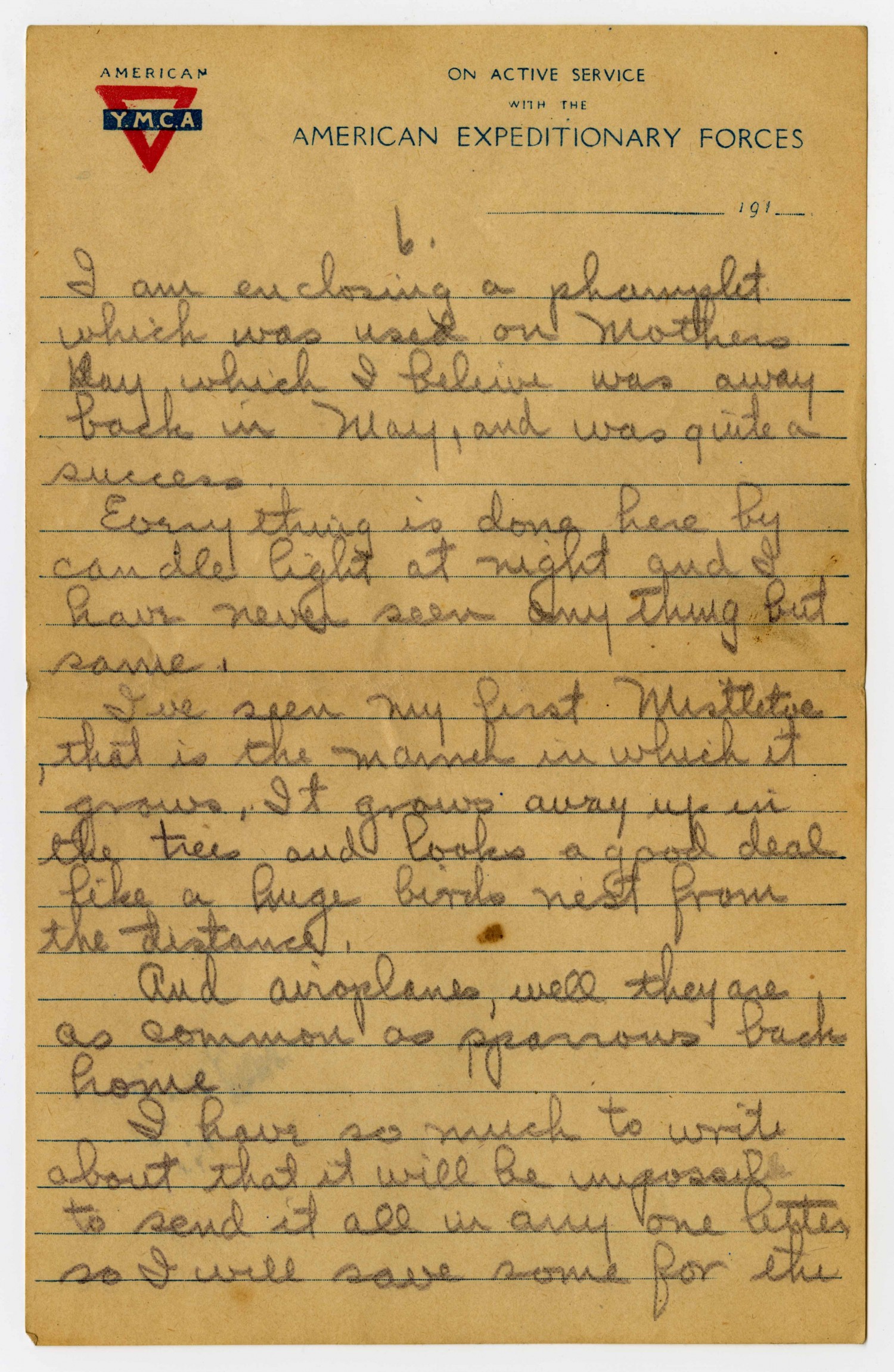 [page 6] [American Y.M.C.A. letterhead] I am enclosing a phamplet which was used on Mothers Day which I believe was away back in May, and was quite a success. Everything is done here by candle light at night and I have never seen anything but same. Ive seen my first Mistletoe that is the manner in which it grows. It grows away up in the trees and looks a good deal like a huge birds nest from the distance. And aeroplanes, well they are as common as sparrows back home I have so much to write about that it will be impossib to send it all in any one letter so I will save some for the