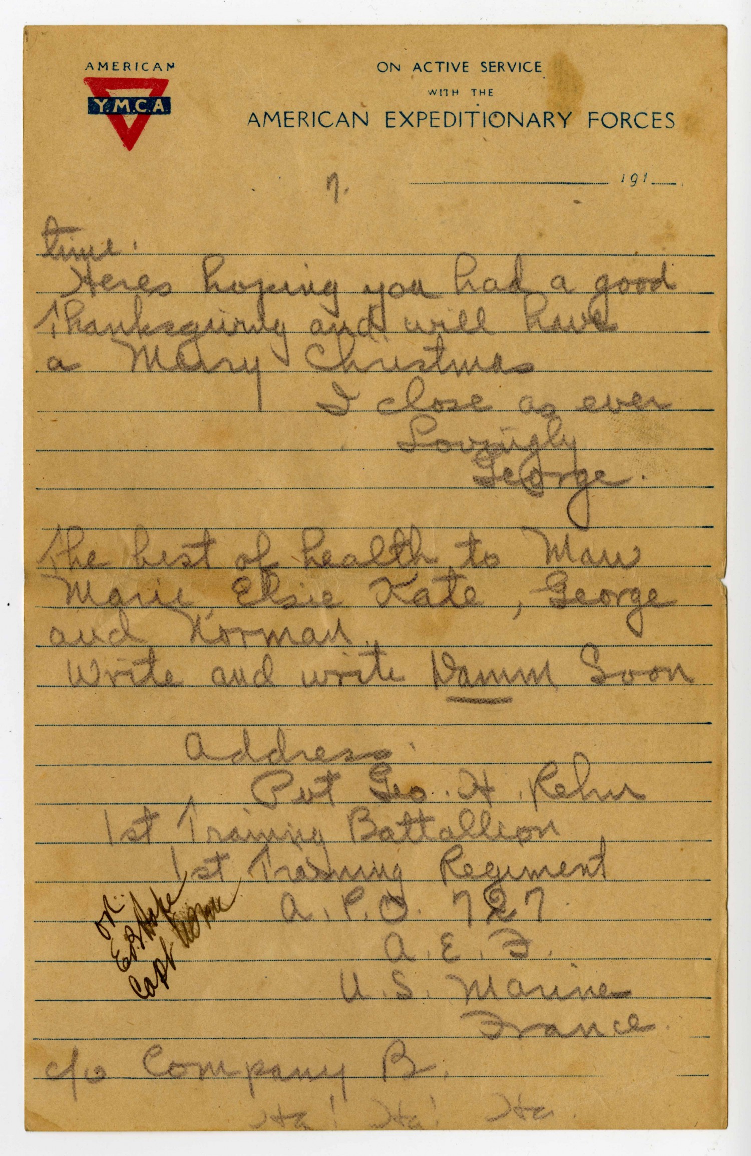 [page 7] [American Y.M.C.A. letterhead] time. Heres hoping you had a good Thanksgiving and will have a Merry Christmans I close as ever Lovingly George. The best of health to Man Marie, Elsie Kate, George and Norman. Write and write Damm Soon Address Pvt Geo. H. Rehn 1st Raining Battallion 1st Training Regiment A.P.O. 727 A.E.F. U.S. Marines France c/o Company B. Ha! Ha! Ha. [sensors signature]