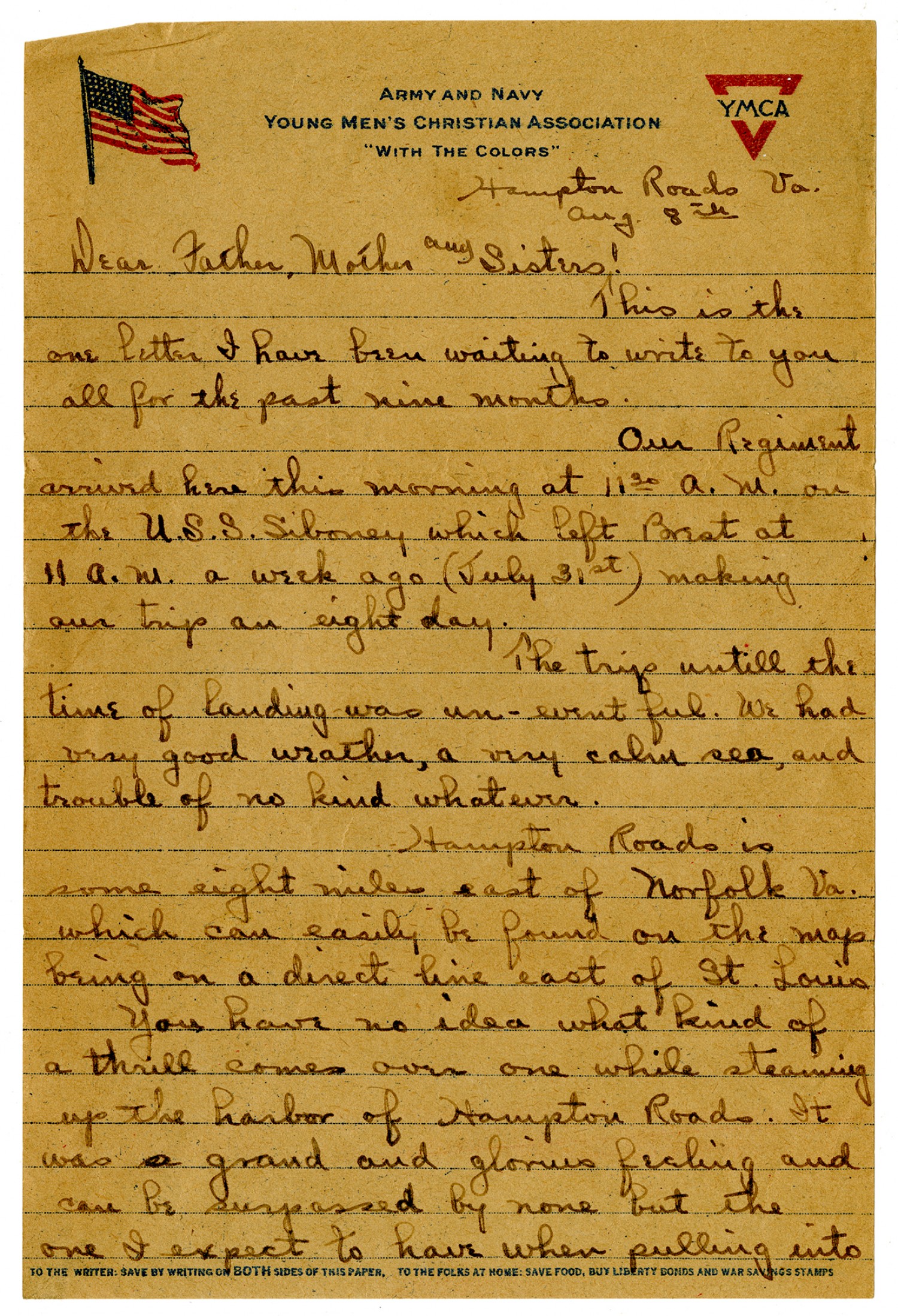 [American Y.M.C.A. letterhead] Hampton Roads [Virginia] [August] 8th Dear Father, Mother and Sisters! This is the one letter I have been waiting to write to you all for the past nine months. Our Regiment arrived here this morning at 1130 A.M. on the U.S.S. Siboney which left Brest at 11 A.M. a week ago (July 31st) making our trip an eight day. The trip untill the time of landing was un-eventful. We had very good weather, a very calm sea, and trouble of no kind whatever. Hampton Roads is some eight miles east of Norfolk [Virginia] which can easily be found on the map being on a direct line east of St. Louis You have no idea what kind of a thrill comes over one while steaming up the harbor of Hampton Roads. It was a grand and glorious feeling and can be surpassed by none but the one I expect to have when pulling into