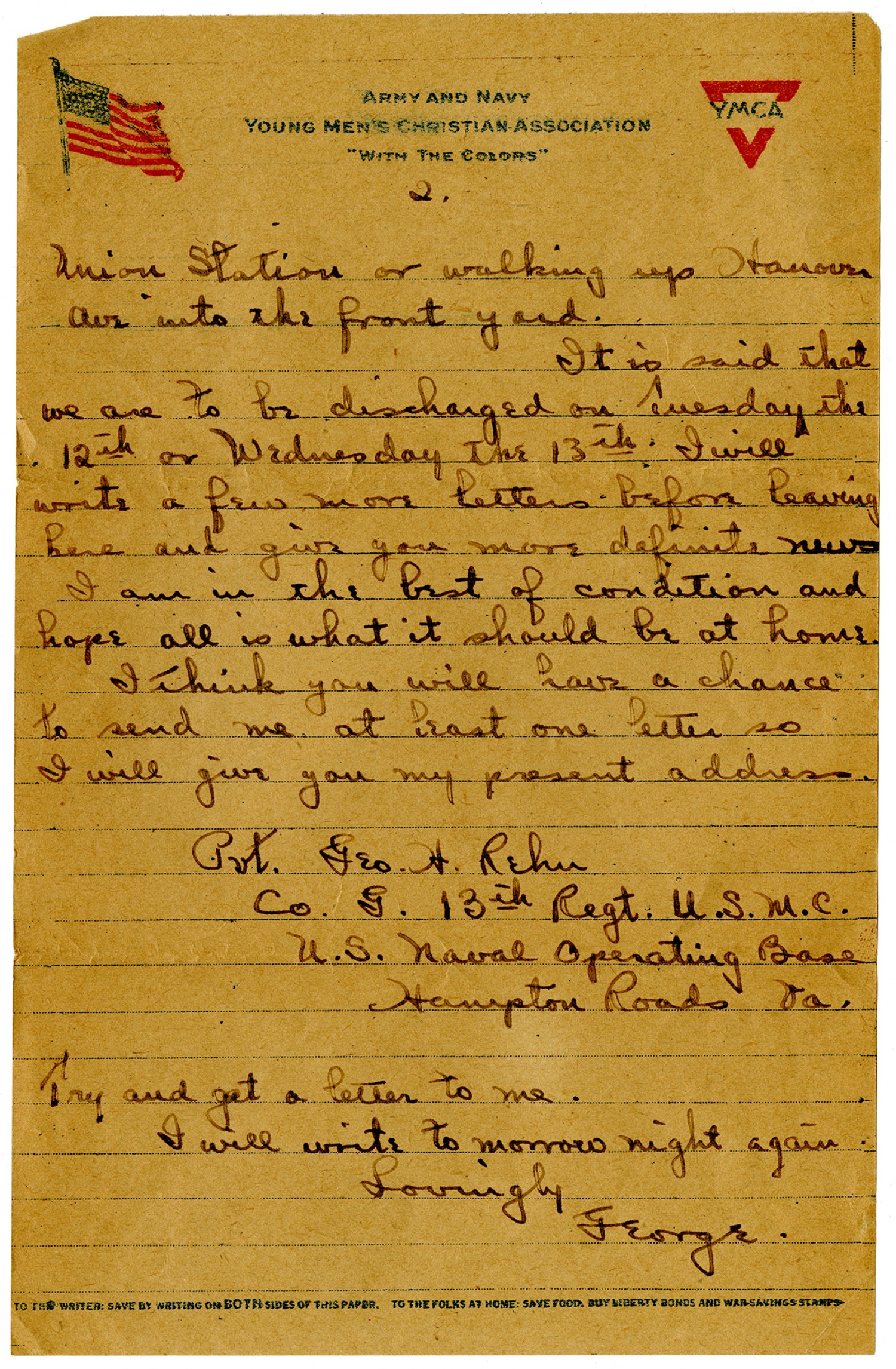 [page 2] [American Y.M.C.A. letterhead] Union Station or walking up Hanover Ave into the front yard. It is said that we are to be discharged on Tuesday the 12th or Wednesday the 13th. I will write a few more letters before leaving here and give you more definite news I am in the best of condition and hope all is what it should be at home. I think you will have a chance to send me at least one letter so I will give you my present address. Pvt. [George] H. Rehn Co. G. 13th Regt. U.S.M.C. U.S. Naval Operating Base Hampton Roads [Virginia] Try and get a letter to me. I will write tomorrow night again. Lovingly George.