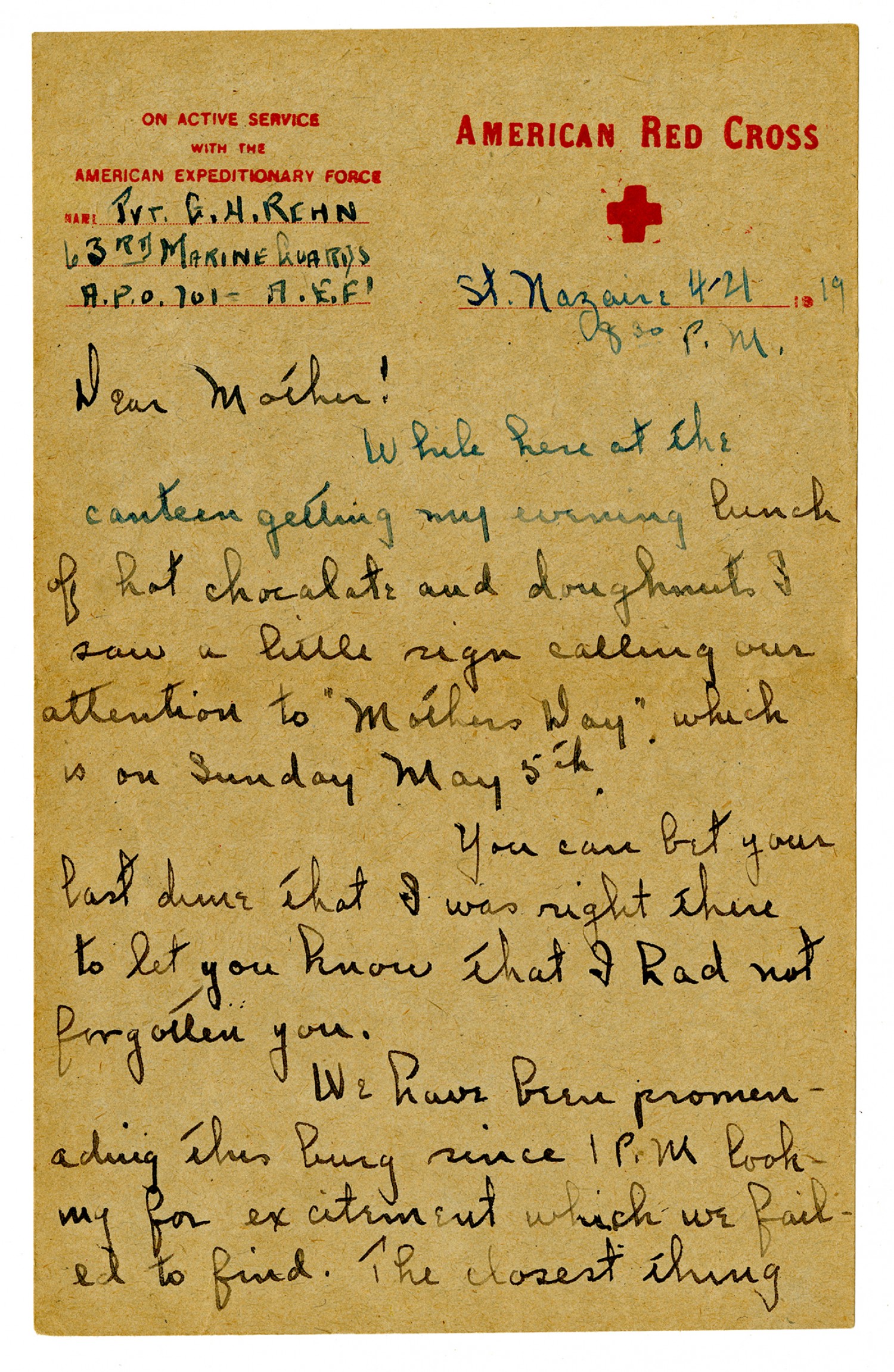 [American Red Cross letterhead] Pvt. G. H. REHN 63rd MARINE GUARDS A.P.O. 701 - A.E.F. St. Nazaire [April 4, 1919] 830 P.M. Dear Mother! While here at the canteen getting my evening lunch of hot chocolate and doughnuts I saw a little sign calling our attention to