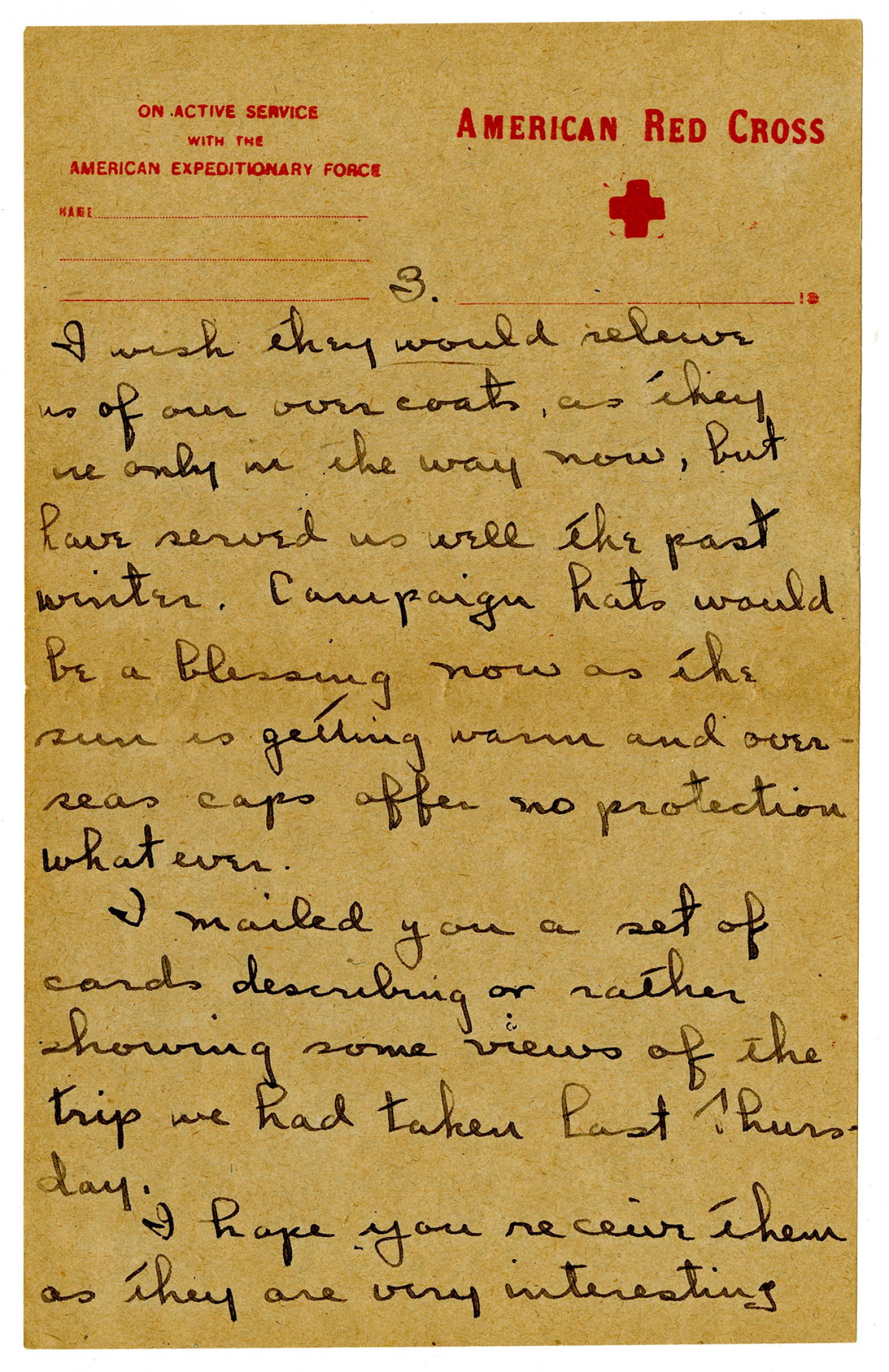 [page 3] [American Red Cross letterhead] I wish they would releive us of our over coats, as they are only in the way now, but have served us well the past winter. Campaign hats would be a blessing now as the sun is getting warm and overseas caps offer no protection what ever. I mailed you a set of cards describing or rather showing some views of the trip we had taken last Thursday. I hope you receive them as they are very interesting