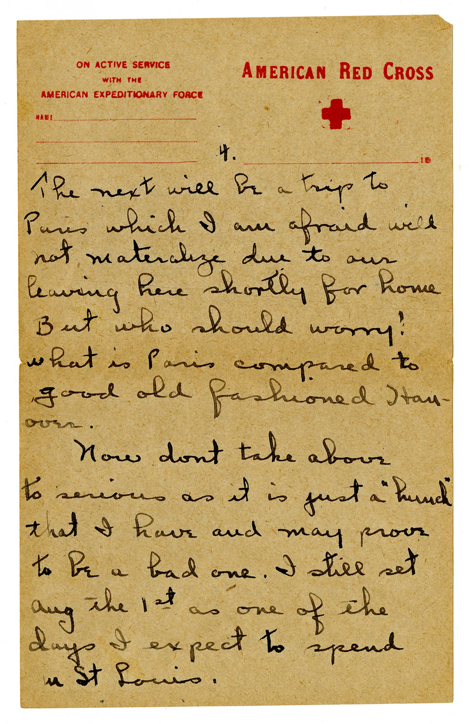 [page 4] [American Red Cross letterhead] The next will be a trip to Paris which I am afraid will not materalize due to our leaving here shortly for home But who should worry! What is Paris compared to good old fashioned Hanover. Now dont take above to serious as it is just a
