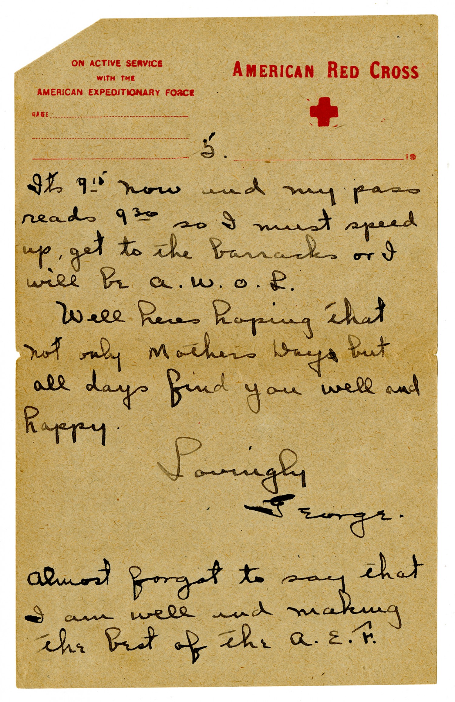 [page 5] [American Red Cross letterhead] Its 915 now and my pass reads 930 so I must speed up, get to the barracks or I will be A.W.O.L. Well heres hoping that not only Mothers Days but all days find you well and happy. Lovingly George. Almost forgot to say that I am well and making the best of the A.E.F.