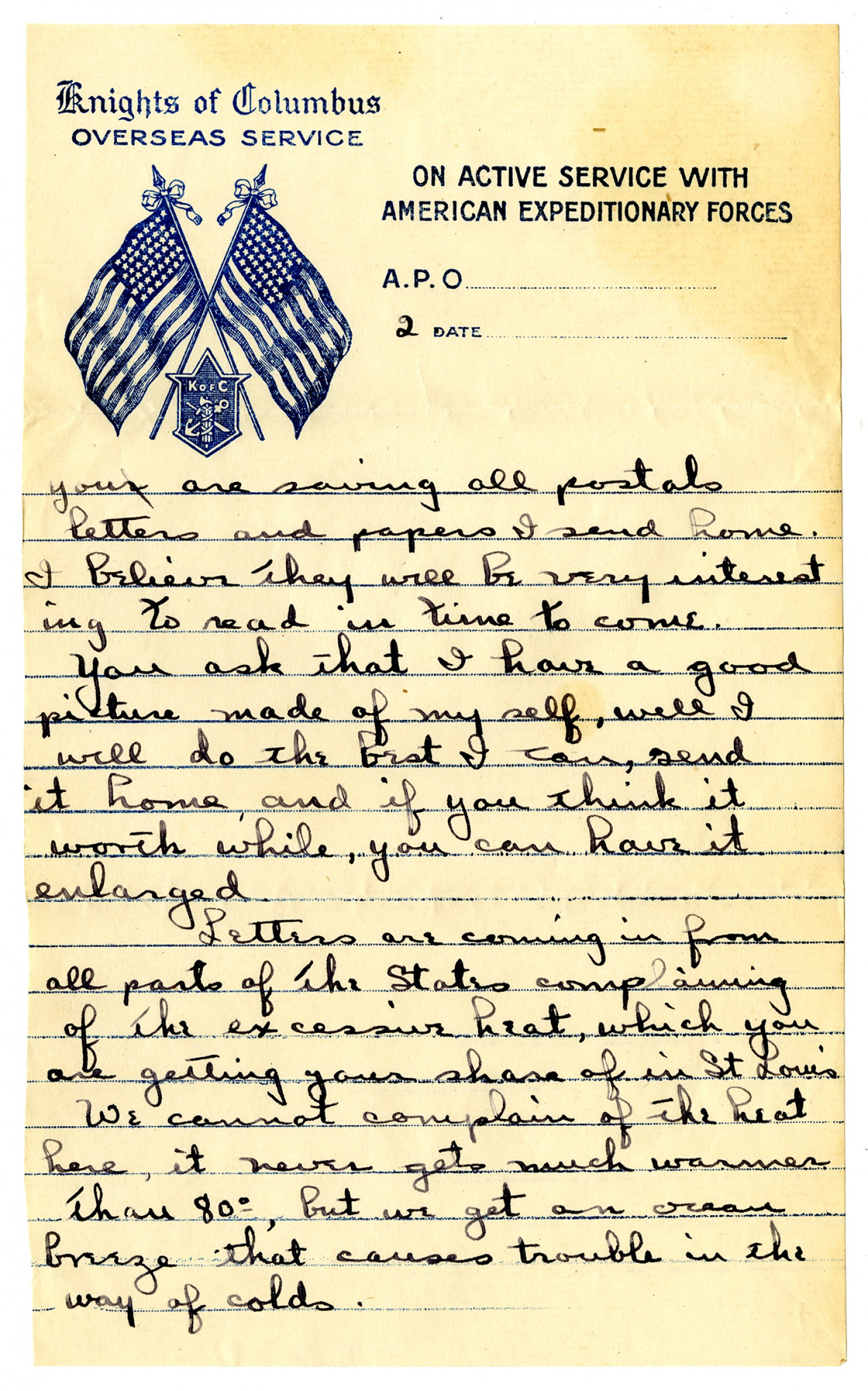 [page 2] [Knights of Columbus letterhead] you are saving all postals letters and papers I send home. I believe they will be very intersting to read in time to come. You ask that I have a good picture made of my self, well I will do the best I can, send it home, and if you think it worth while, you can have it enlarged. Letters are coming in from all parts of the States complaining of the excessive heat, which you are getting your share of in St. Louis We cannot complain of the heat here, it never gets much warmer than 80, but we get an ocean breeze that causes trouble in the way of colds.