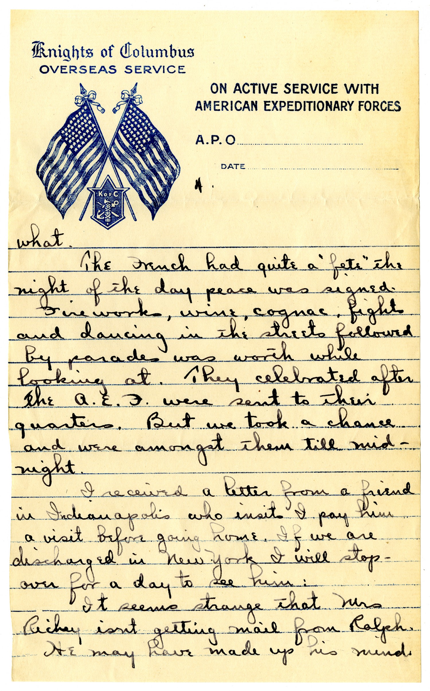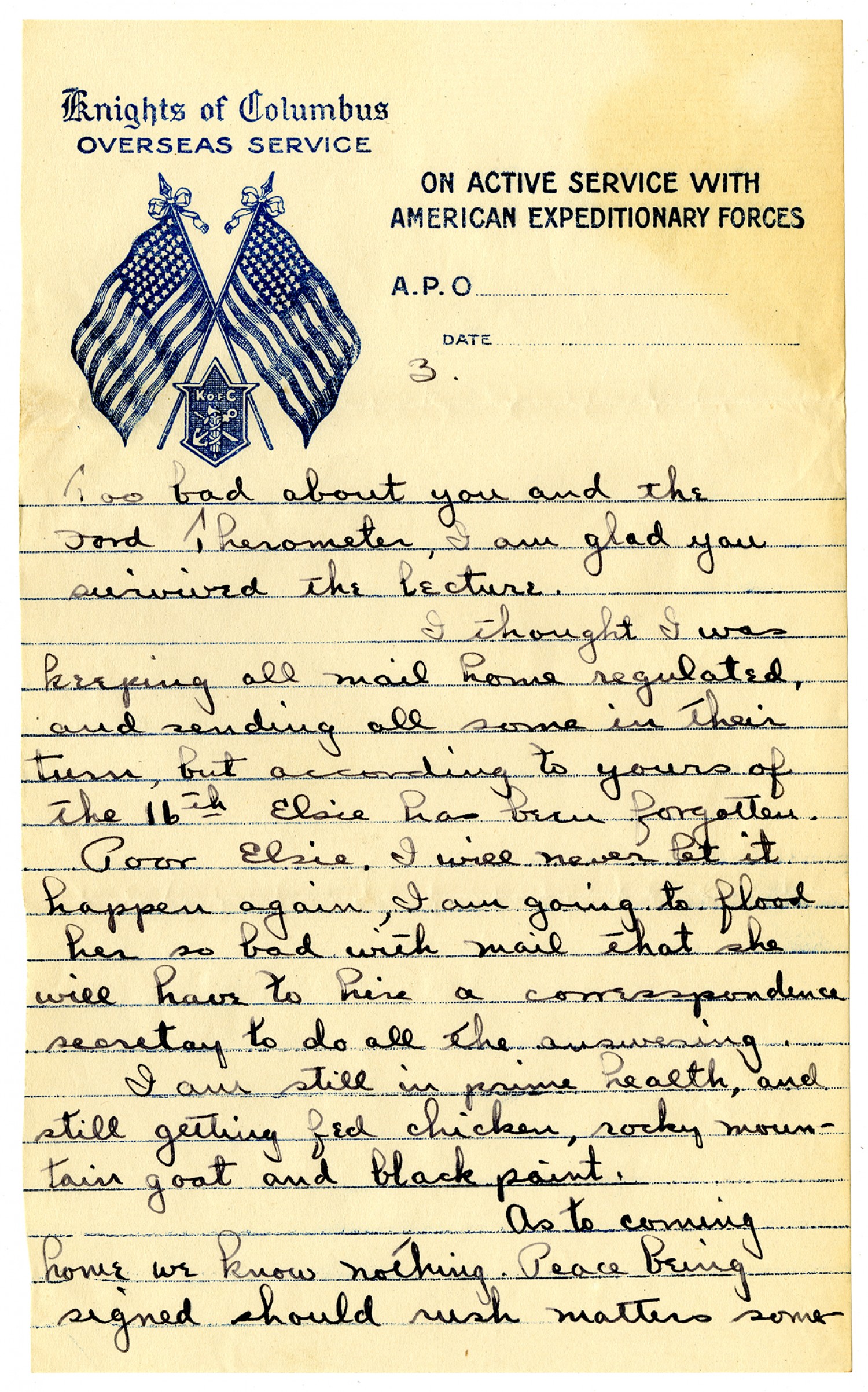 [page 3] [Knights of Columbus letterhead] Too bad about you and the Ford Therometer, I am glad you survived the lecture. I thought I was keeping all mail home regulated, and sending all some in their turn, but according to yours of the 16th Elsie has been forgotten. Poor Elsie. I will never let it happen again, I am going to flood her so bad with mail that she will have to hire a correspondence secretary to do all the answering. I am still in prime health, and still getting fed chicken, rocky mountain goat and black paint. As to coming home we know nothing. Peace being signed should rush matters some