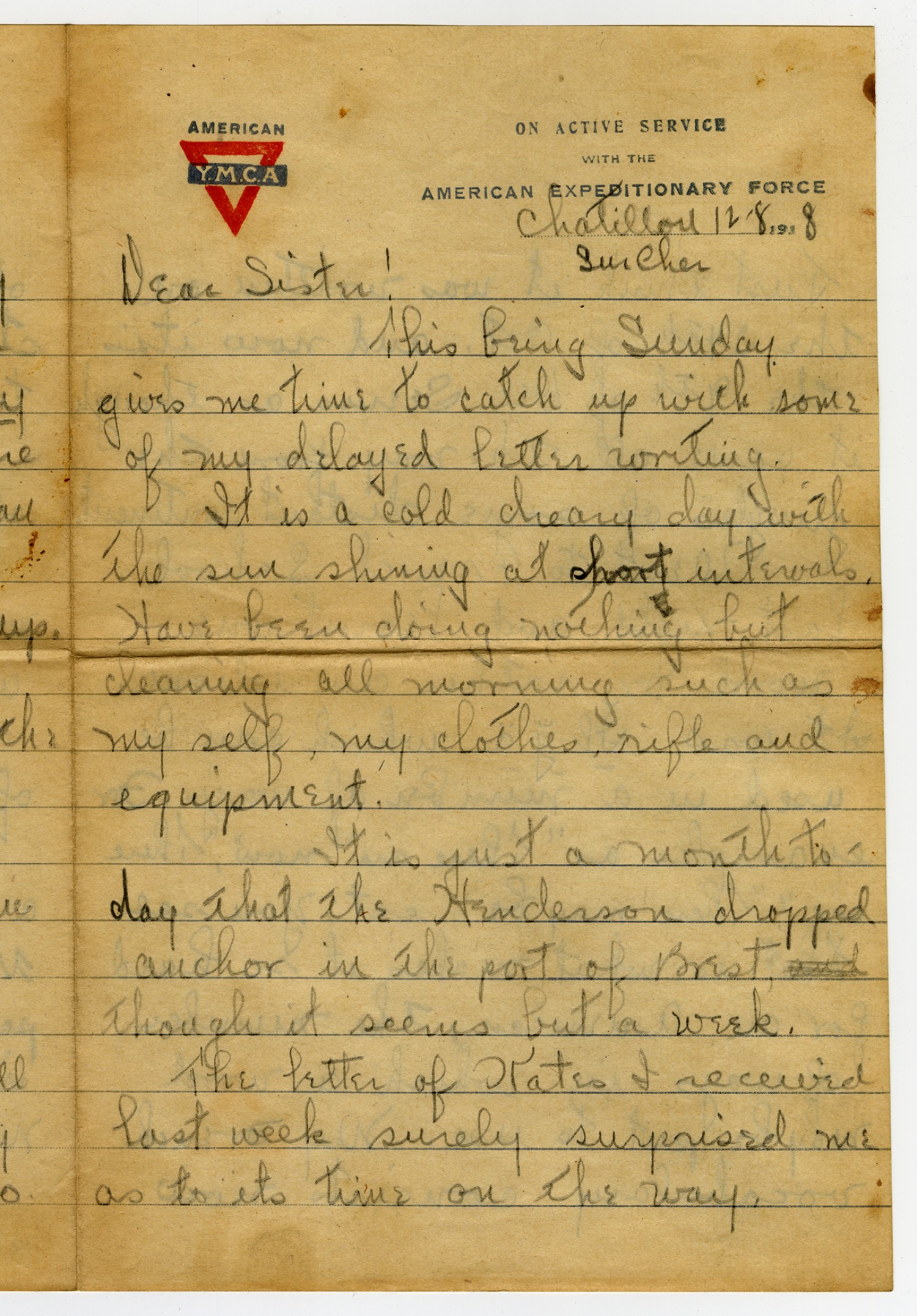 [Chatellon-Sur-Cher] [December 8, 1918] Dear Sister! This being Sunday gives me time to catch up with some of my delayed letter writing. It is a cold dreary day with the sun shining at short intervals. Have been doing nothing but cleaning all morning such as my self, my clothes, rifle and equipment. It is just a month today that the Henderson dropped anchor in the port of Brest, though it seems but a week. The letter of Kates I received last week surely surprised me as to its time on the way.