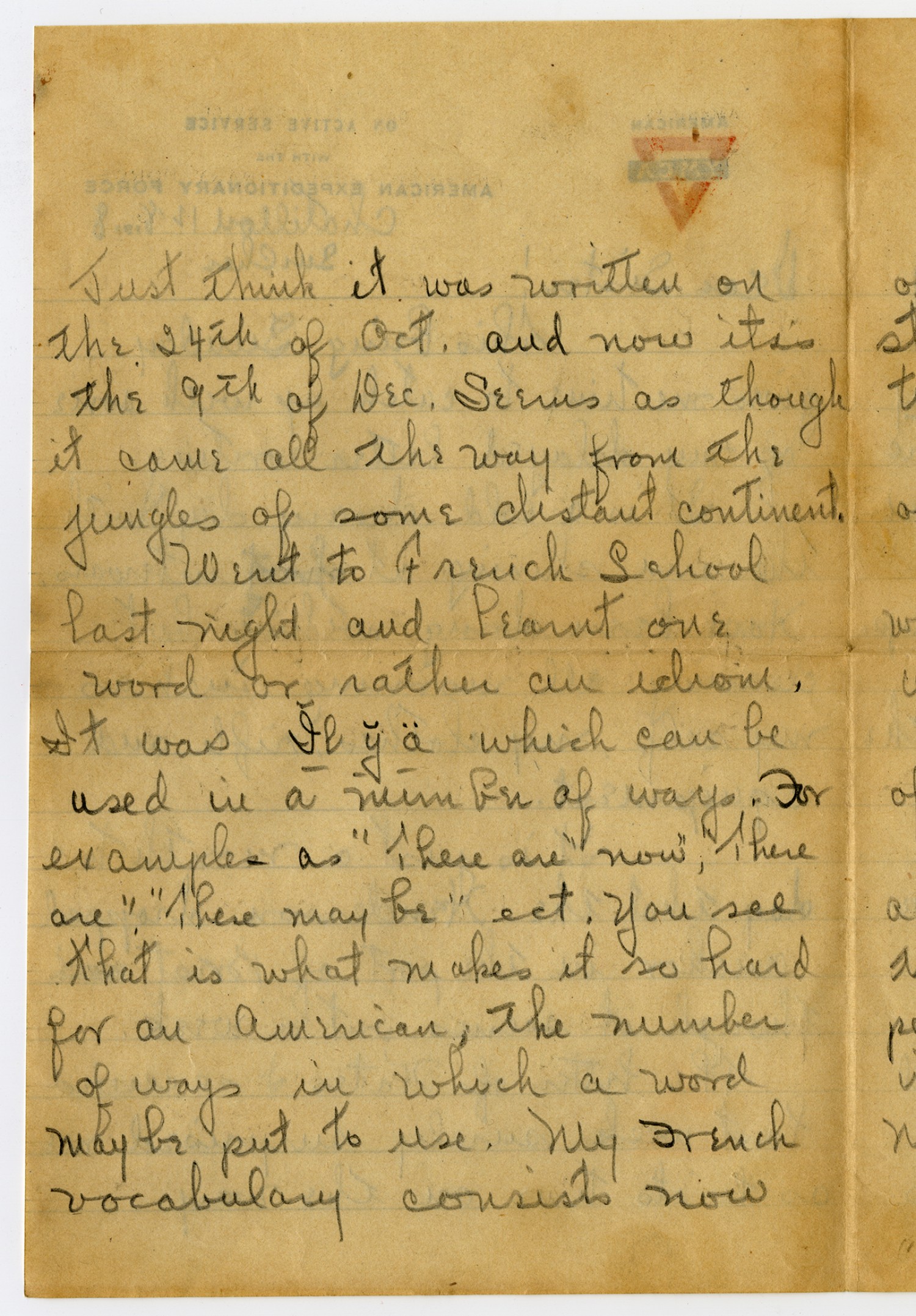 | Description | George Rehn sent this letter to his sister while over in France on December 8, 1918. Rehn discussed French vocabulary lessons, Christmas dinner, daily activities, and rumors of returning home. George Rehn was part of the 63rd Guard Unit, 13th Marine Regiment. Rehn served in France from November 1918 to July 1919 as part of Company B, 9th SEP Battalion. |