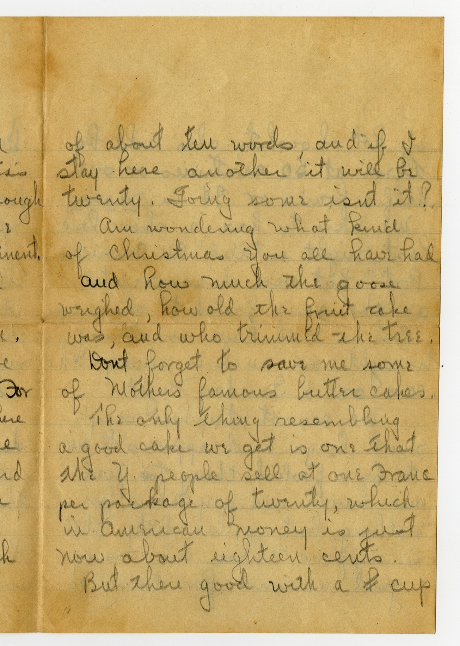 of about ten words, and if I stay here another it will be twenty. Going some isnt it? Am wondering what kind of Christmas you all have had and how much the goose weighted, how old the fruit cake was, and who trimmed the tree. Dont forget to save me some of mothers famous butter cakes. The only thing resembling a good cake we get is one that the Y. people sell at one Franc per package of twenty, which in American money is just now about eighteen cents. But there good with a cup