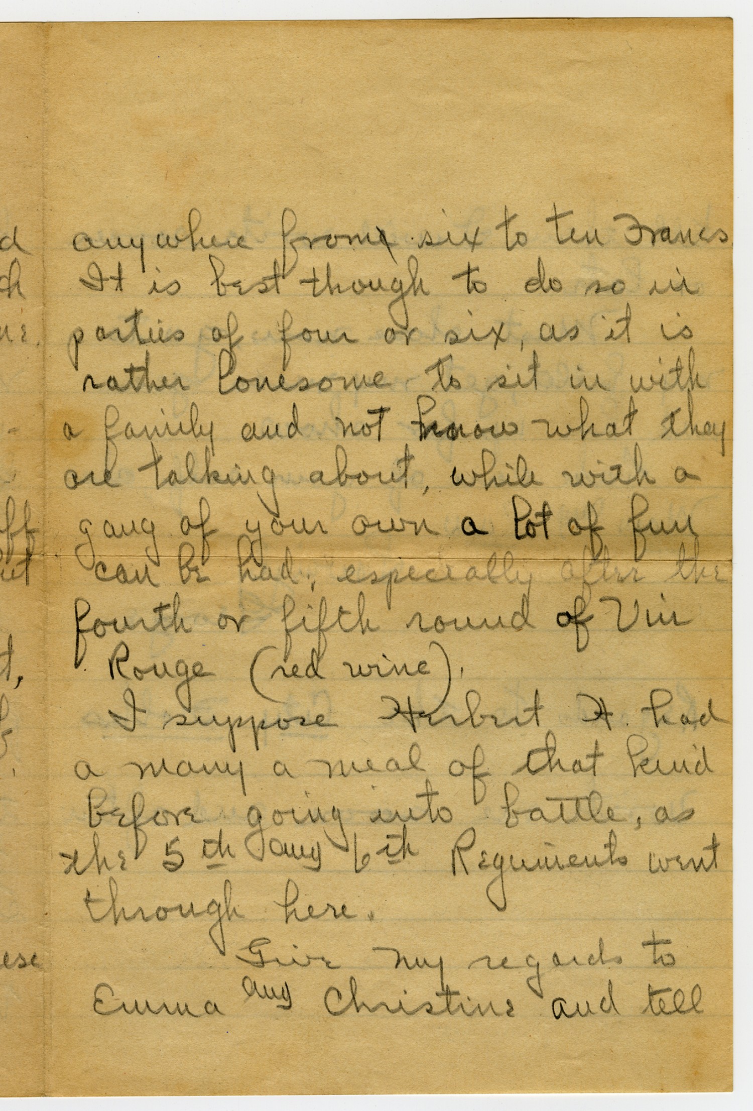 anywhere from six to ten Francs It is best though to do so in parties of four or six, as it is rather lonesome to sit in with a family and not know what they are talking about, while with a gang of your own a lot of fun can be had, especially after the fourth or fifth round of Vin Rouge (red wine). I suppose Herbert H. had a many a meal of that kind before going into battle, as the 5th and 6th Regiments went through here. Give my regards to Emma and Christine and tell