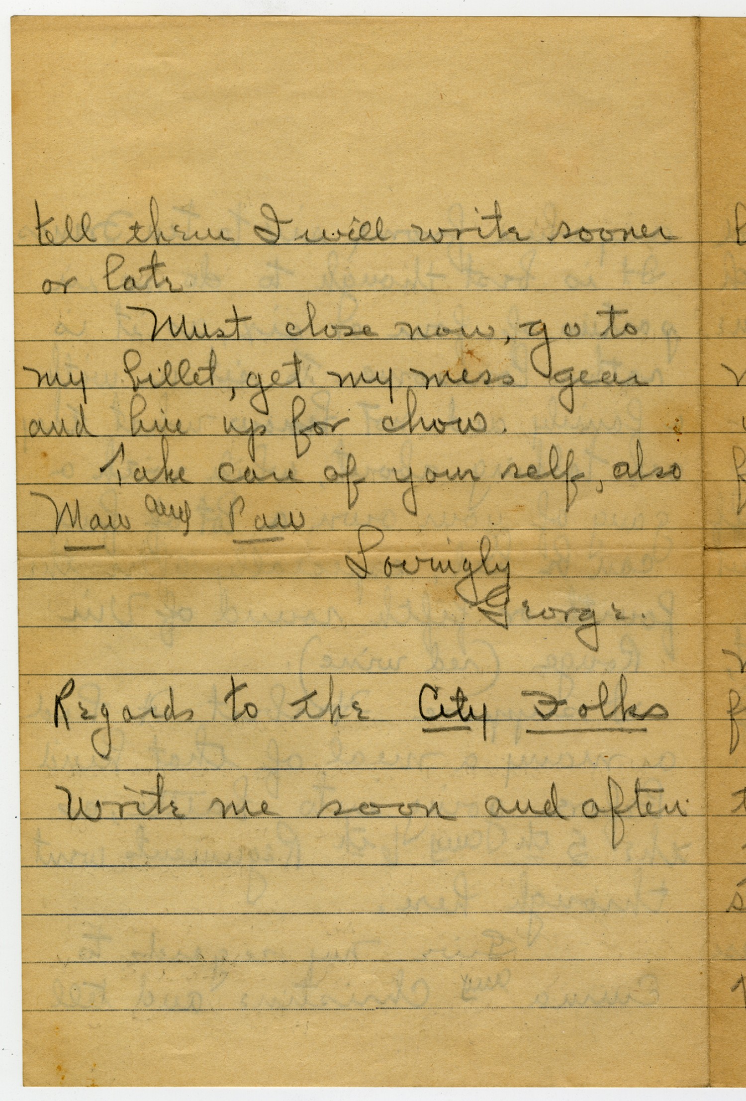 tell them I will write sooner or late. Must close now, go to my billet, get my mess gear and line up for chow. Take care of your self, also Maw and Paw Lovingly George. Regards to the City Folks Write me soon and often