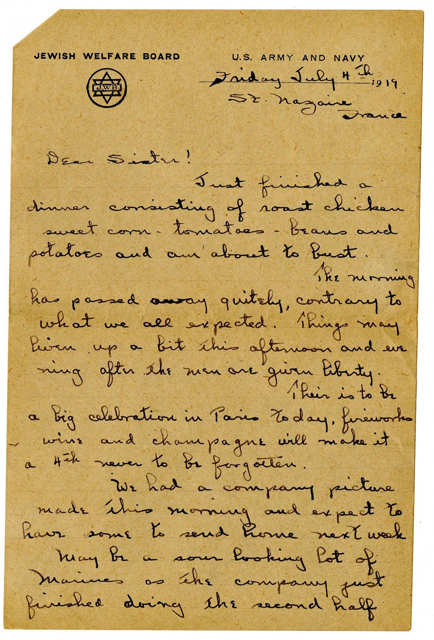 [JEWISH WELFARE BOARD letterhead] Friday July 4th 1919 St. Nazaire France Dear Sister! Just finished a dinner consisting of roast chicken sweet corn - tomatoes - beans and potatoes and am about to bust. The morning has passed away quitely, contrary to what we all expected. Things may liven up a bit this afternoon and evening after the men are given liberty. Their is to be a big celebration in Paris today, fireworks wine and champagne will make it a 4th never to be forgotten. We had a company picture made this morning and expect to have some to send home next week May be a sour looking lot of Marines as the company just finished doing the second half