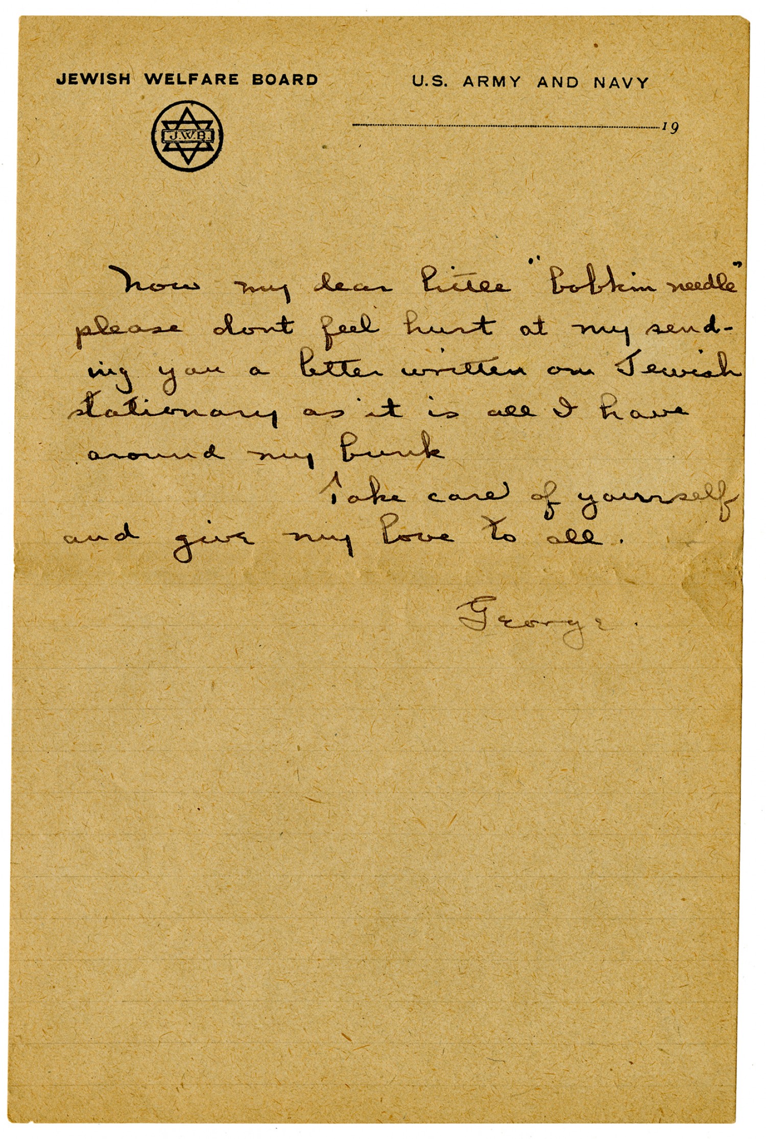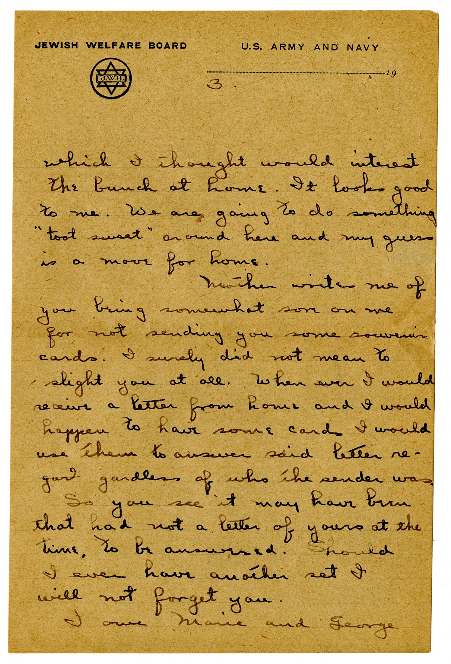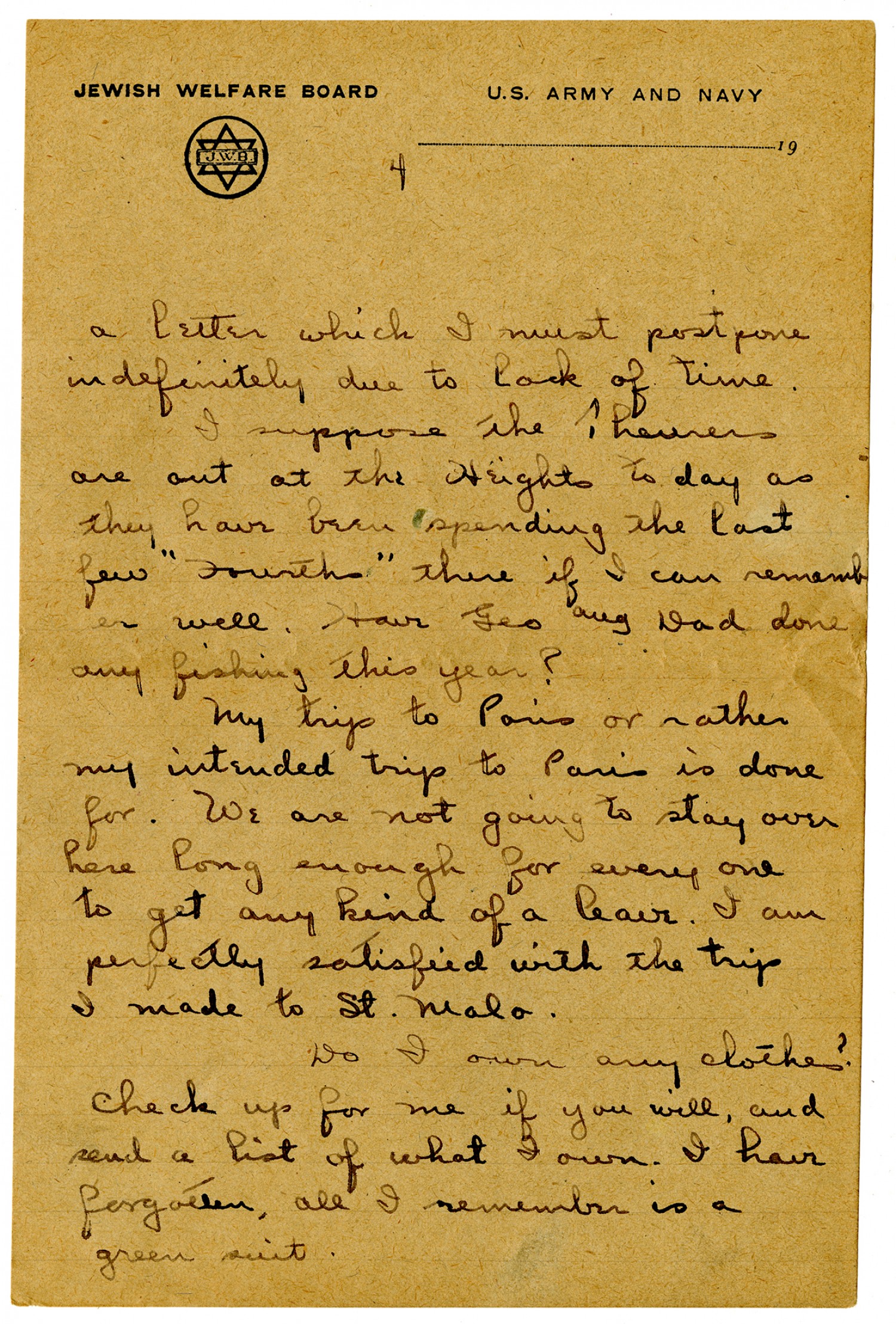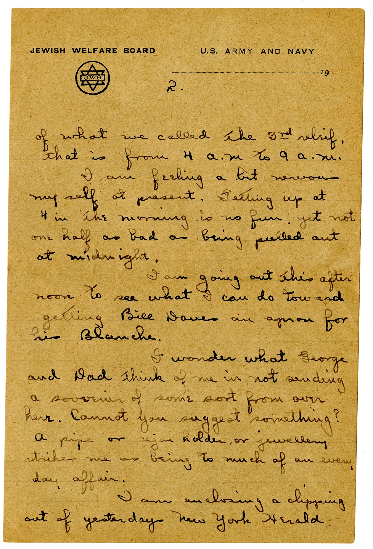 [page 2] [JEWISH WELFARE BOARD letterhead] of what we called the 3rd releif, that is from 4 a.m to 9 a.m. I am feeling a bit nervous myself at present. Getting up at 4 in the morning is no fun, yet not one half as bad as being pulled out at midnight. I am going out this afternoon to see what I can do toward getting Bill Daues an apron for his Blanche. I wonder what George and Dad think of me in not sending a souvenir of some sort from over here. Cannot you suggest something? A pipe or cigar holder, or jewellery strikes me as being to much of an every day affair. I am enclosing a clipping out of yesterdays New York Herald