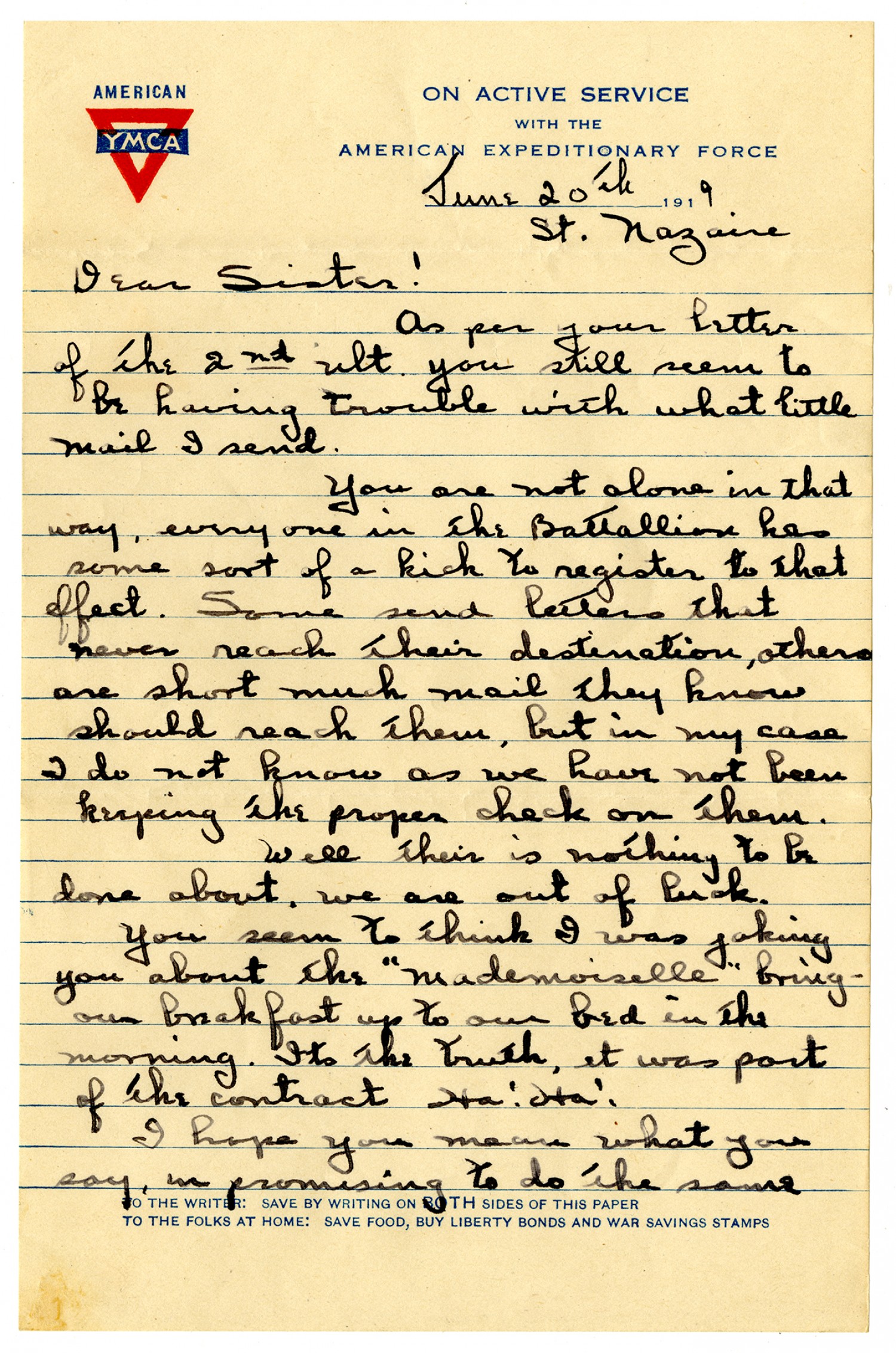 [American Y.M.C.A letterhead] June 20th 1919. St. Nazaire Dear Sister! As per your letter of the 2nd ult. you still seem to be having trouble with what little mail I send. You are not alone in that way, every one in the Battalion has some sort of a kick to register to that effect. Some send letters that never reach their destination, others are short much mail they know should reach them, but in my case I do not know as we have not been keeping the proper check on them. Well their is nothing to be done about, we are out of luck. You seem to think I was joking you about the