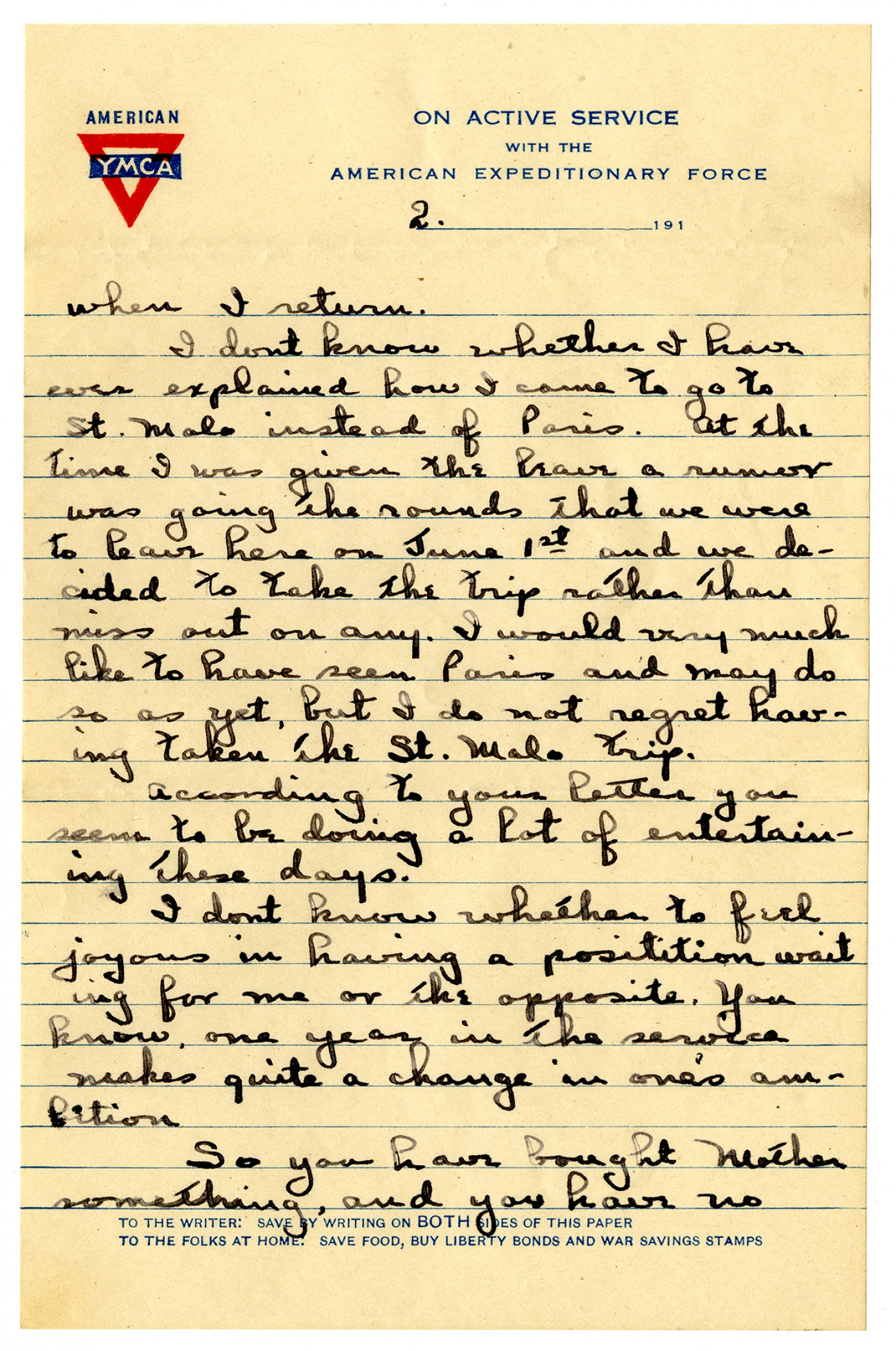 [page 2] [American Y.M.C.A letterhead] when I return. I dont know whether I have ever explained how I came to go to St. Malo instead of Paris. At the time I was given the leave a rumor was going that we were to leave here on June 1st and we decided to take the trip rather than miss out on any. I would very much like to have seen Paris and may do so as yet, but I do not regret having taken the St. Malo trip. According to your letter you seem to be doing a lot of entertaining these days. I dont know whether to feel joyous in having a positition waiting for me or the opposite. You know, one year in the service makes quite a change in one