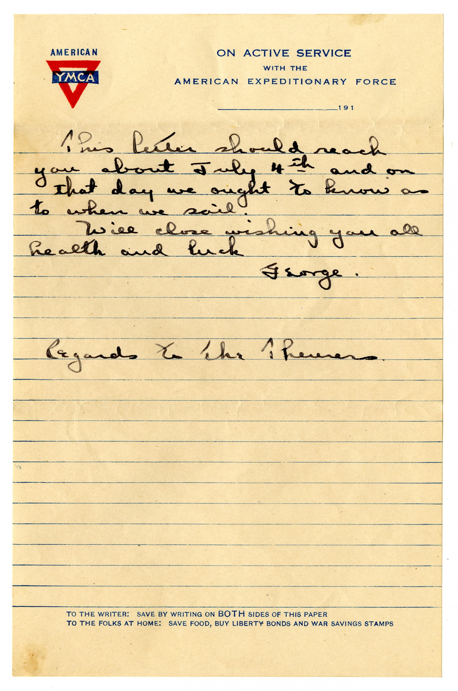 This letter should reach you about July 4th and on that day we ought to know as to when we sail. Will close wishing you all health and luck George. Regards to the Theurers