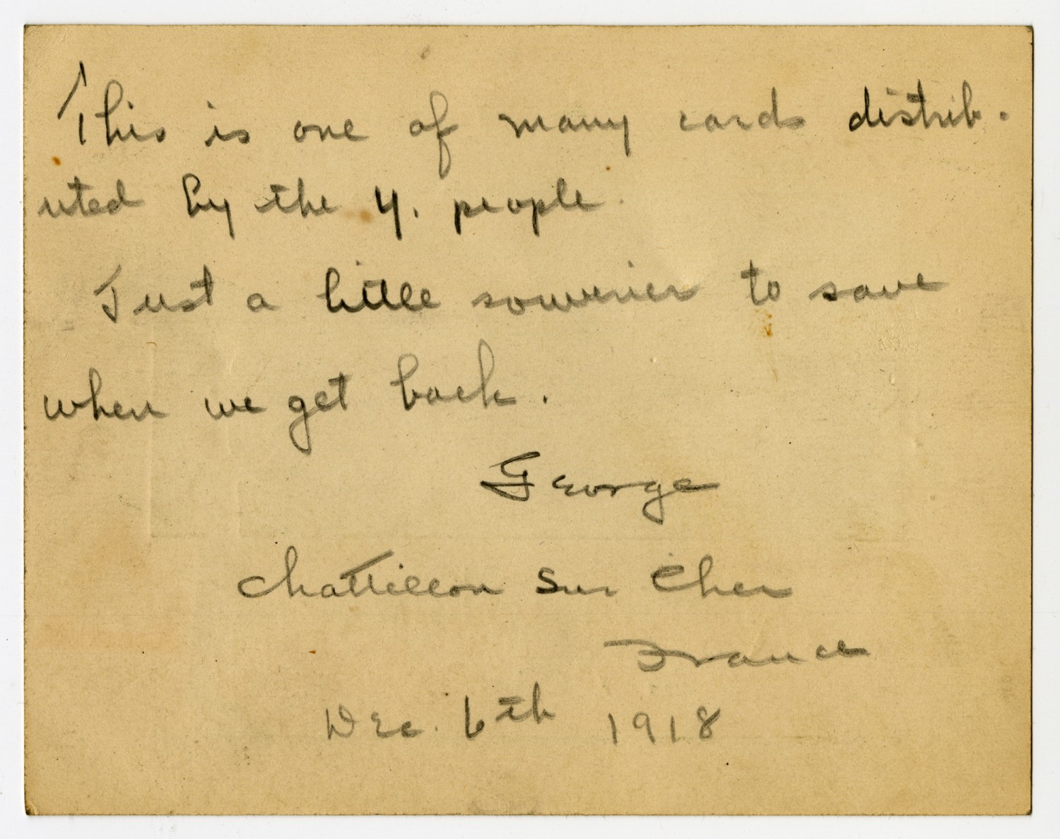 This is one of many cards distributed by the Y. people Just a little souvenier to save when we get back. George [Chatellon-Sur-Cher] France [December] 6th 1918