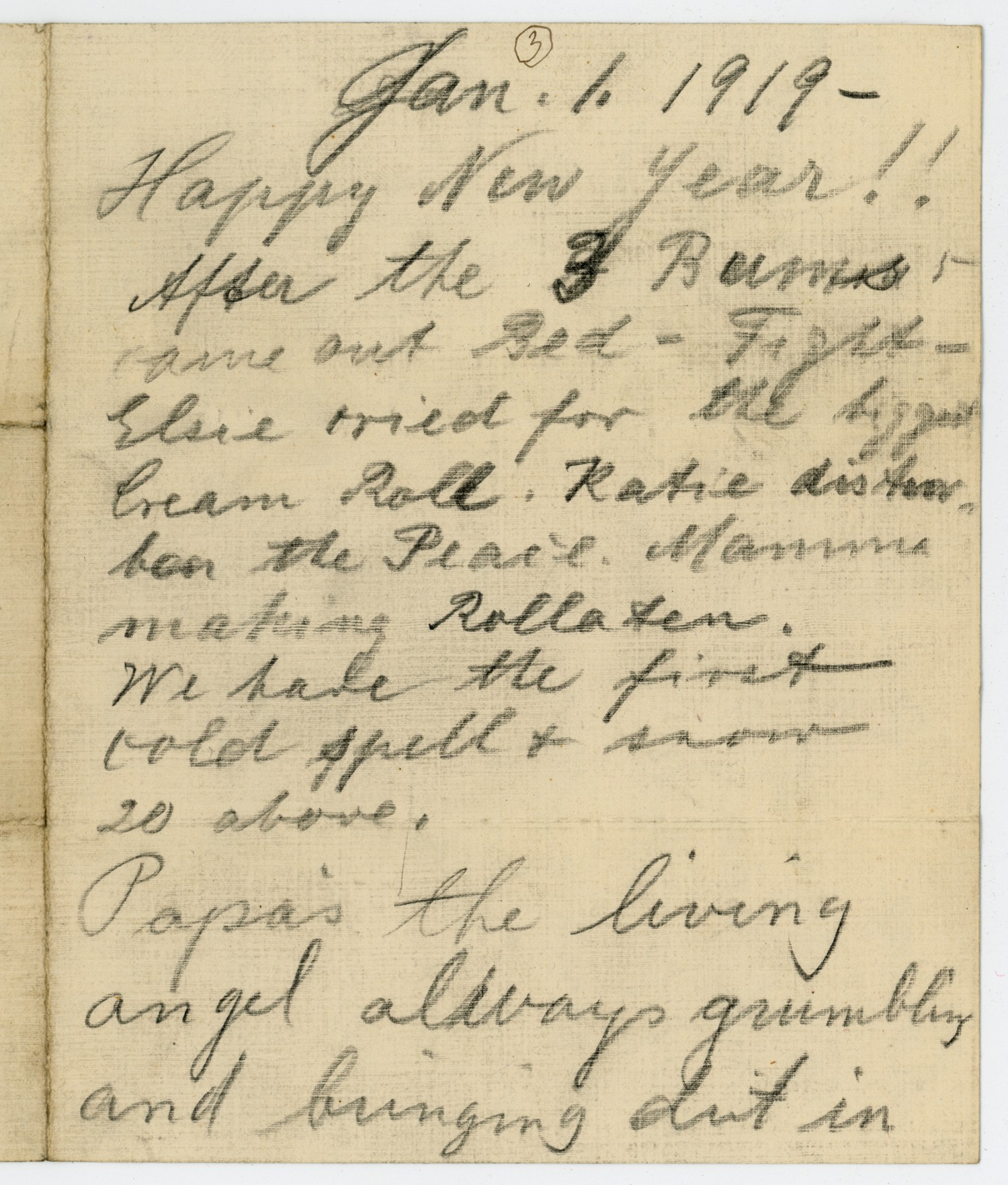 [page 3] [January] 1, 1919 - Happy New Year!! After the 3 Bums came out Bed - Fight - Elsie cried for the biggest Cream Roll. Katie disturbed the Peace. Mamma making Rollaten. We have the first cold spell & snow 20 above. Papa