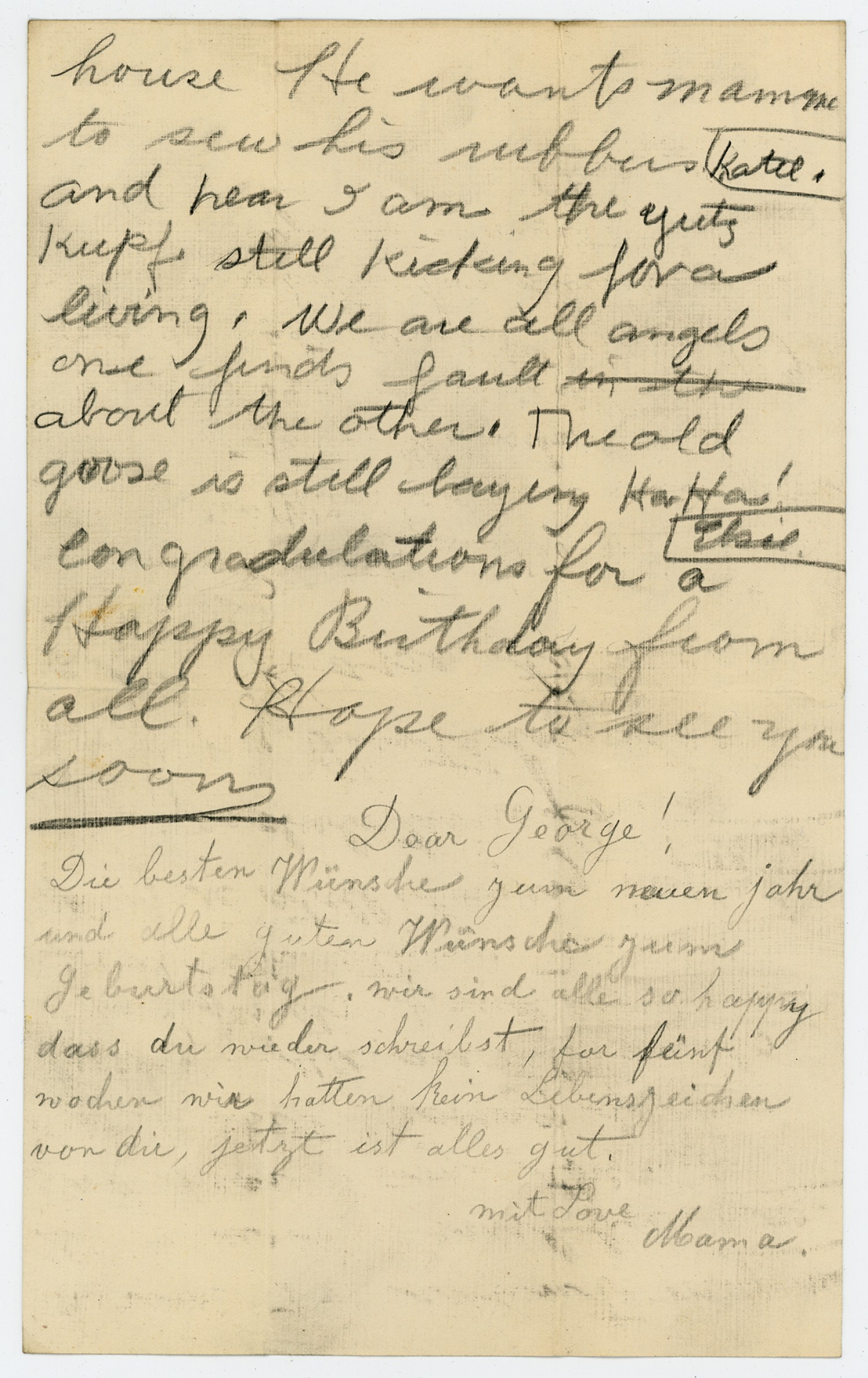 house He wants mamma to sew his rubbers and hear I am the yutz kupf still kicking for a living. We are all angels one finds fault above the other. The old goose is still laying Ha Ha! Congratulations for a Happy Birthday from all. Hope to see you soon [written in margin] Katie Elsie [ms continues as normal] Dear George! [written in German] The best wunsche weiner year to end all good wunsche for birthday we are all so happy that you write again for five weeks we had no Libensjeidren of the , now all is well with Love Mama.
