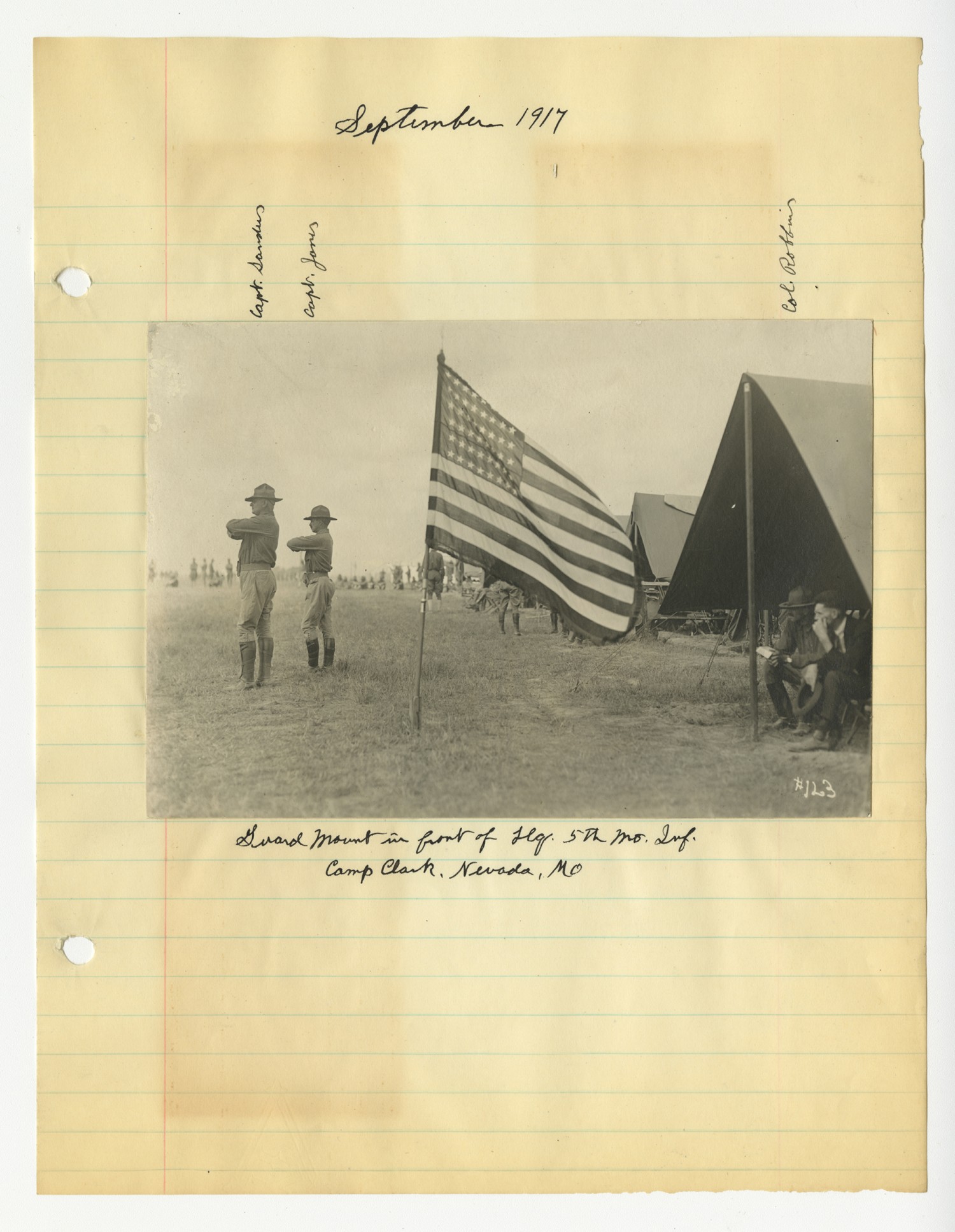 September 1917 Capt. Sanders Capt. Jones Col. Robbins Guard Mount in front of Hq. 5th [Missouri] Inf. Camp Clark, Nevada, [Missouri]