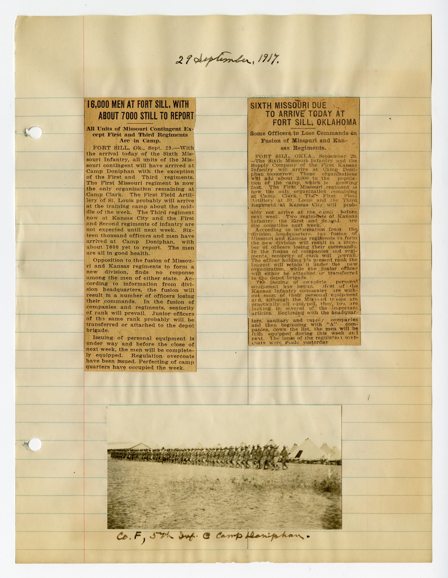 29 September, 1917. [newspaper article] 16,000 Men at Fort Sill, with About 7000 Still to Report [newspaper article] Sixth Missouri Due to Arrive Today at Fort Sill, Oklahoma. Co. F, 5th Inf. C Camp Doniphan