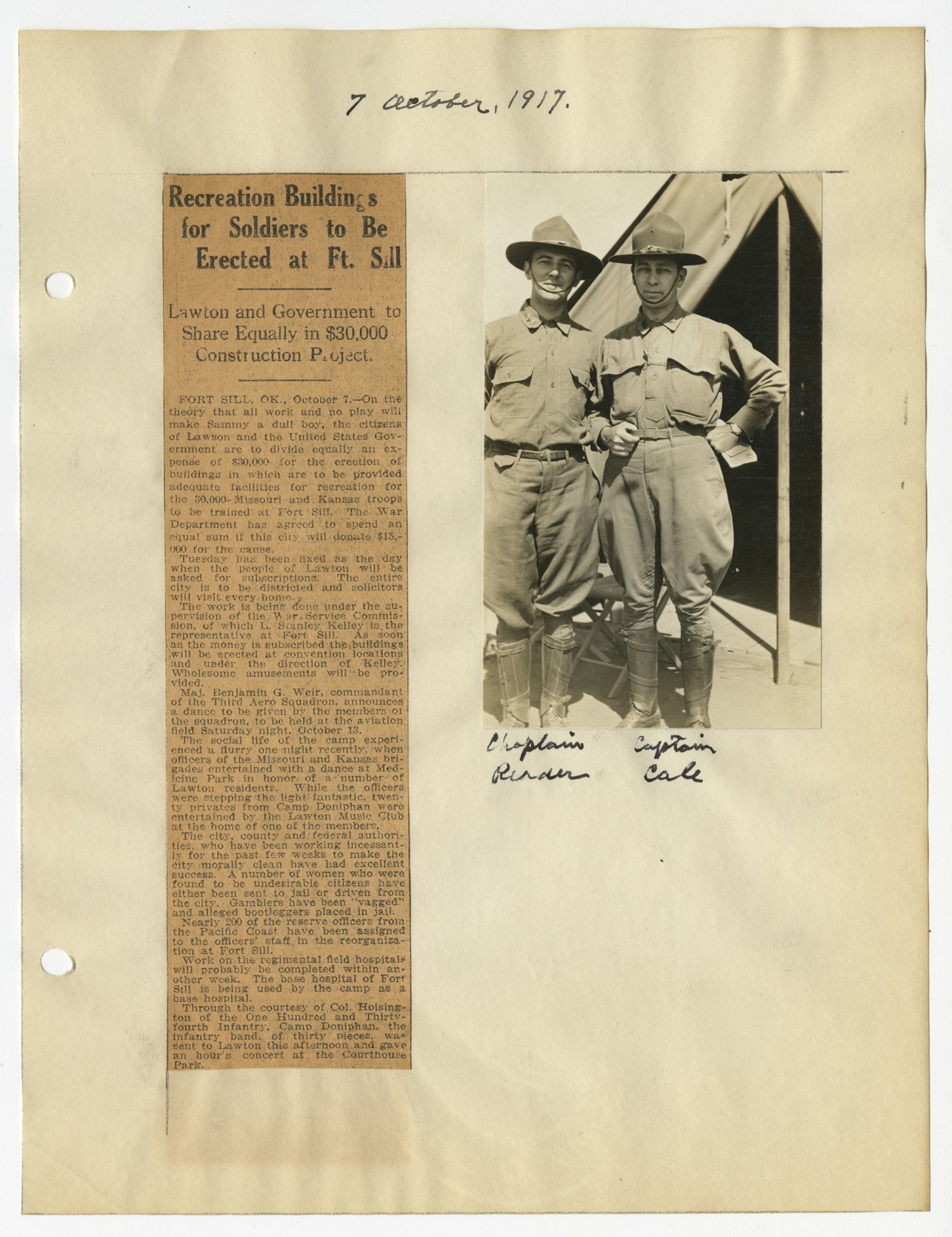 7 October, 1917. [newspaper article] Recreation Buildings for Soldiers to be Erected at Ft. Sill Chaplain Ruder Captain Cale