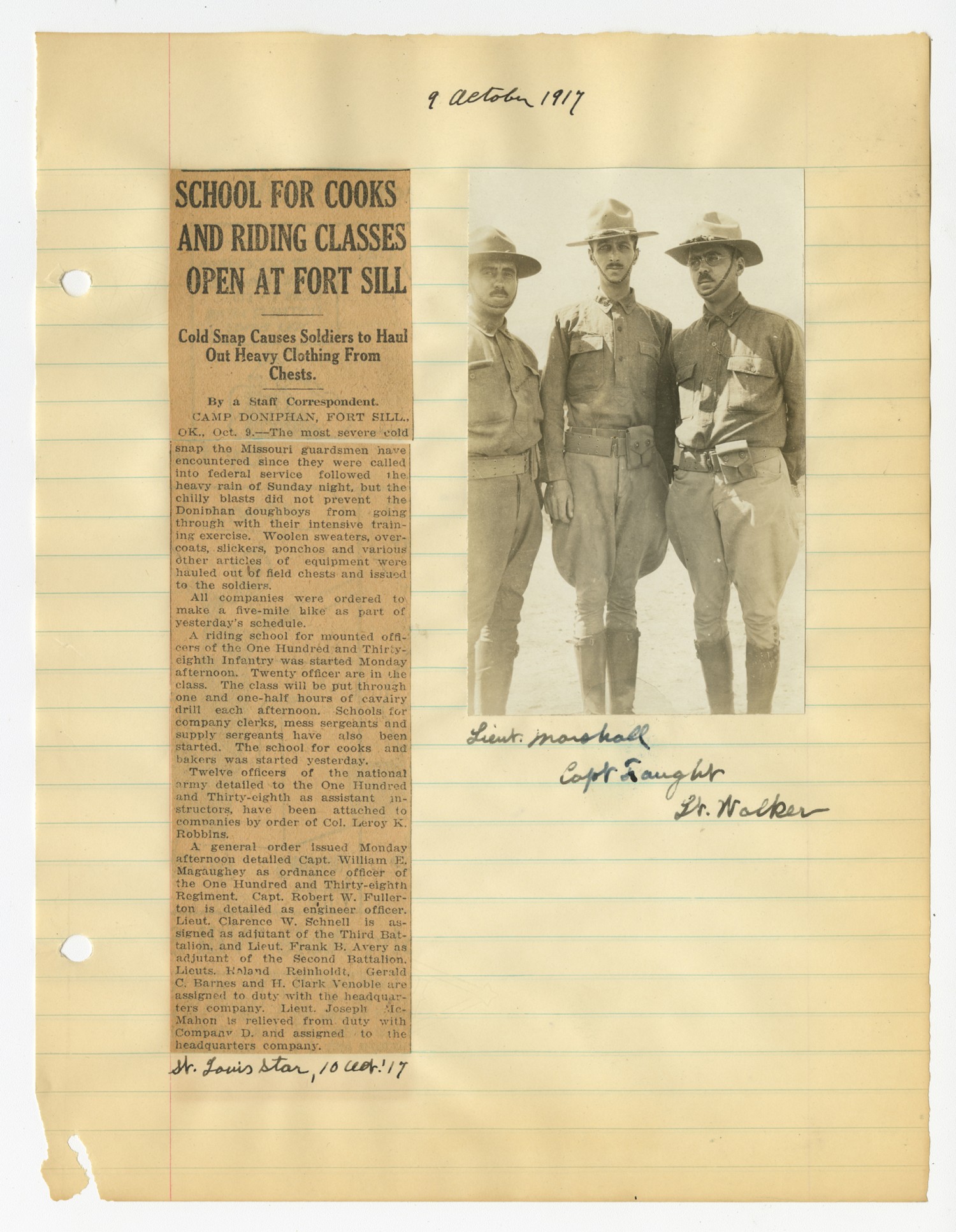 9 October 1917 [newspaper article] School for Cooks and Riding Classes Open at Fort Sill. St. Louis Star, 10 [October 1917] Lieut. Marshall Capt. Taught Lt. Walker