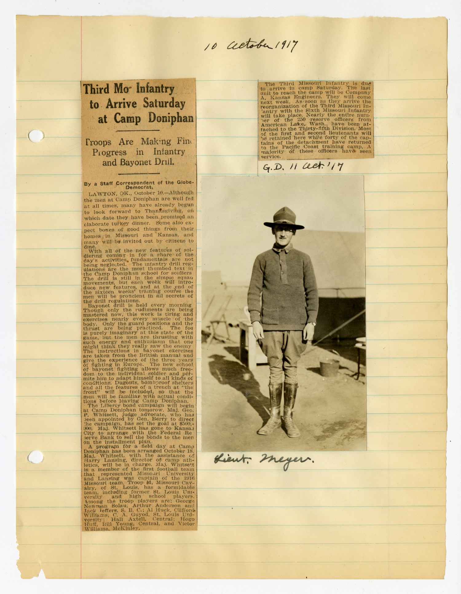 10 October 1917 [newspaper article] Third [Missouri] Infantry to Arrive Saturday at Camp Doniphan G.D. 11 [October 1917] Lieut. Meyer.