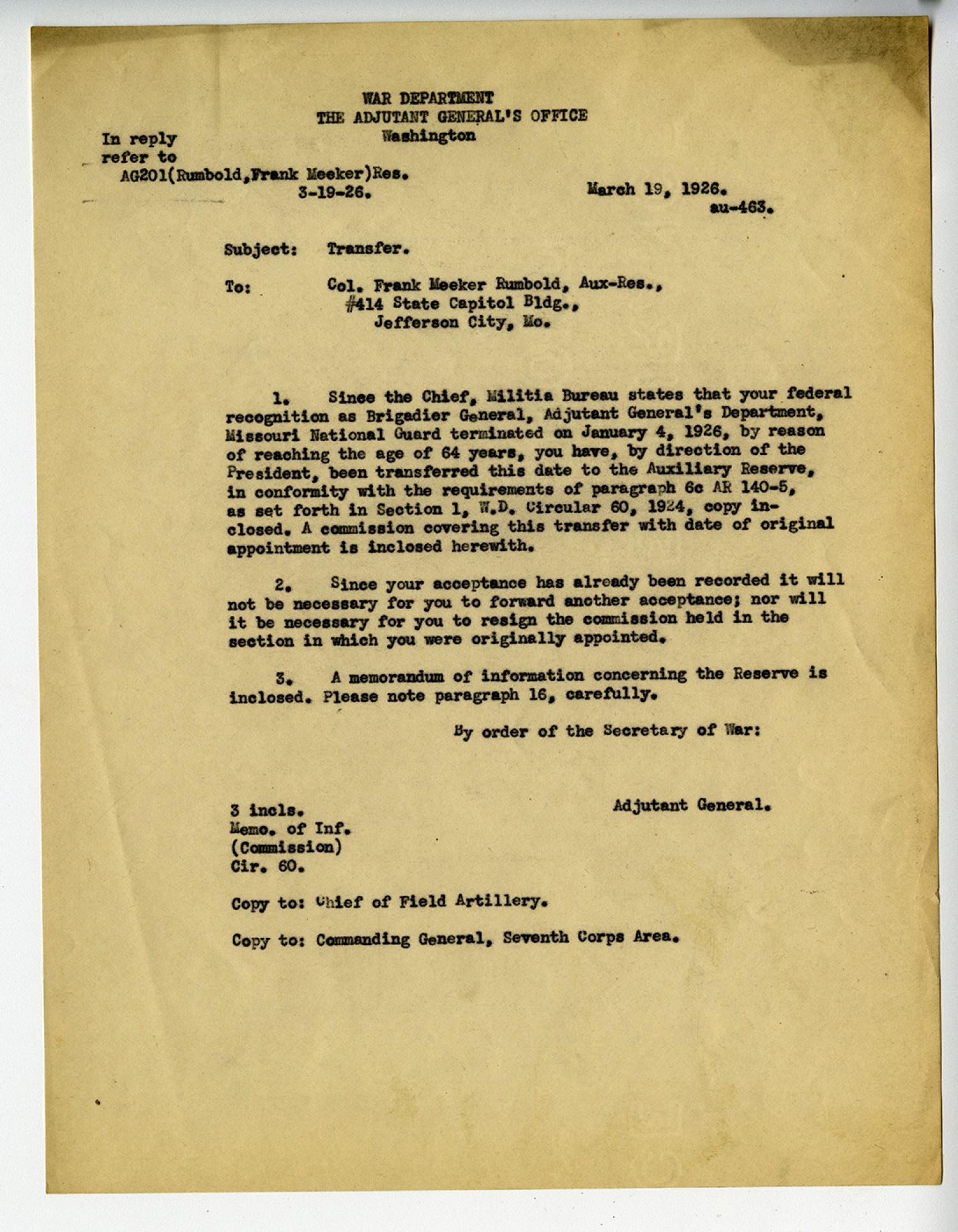 Adjutant General letter to Frank M. Rumbold - March 19, 1926