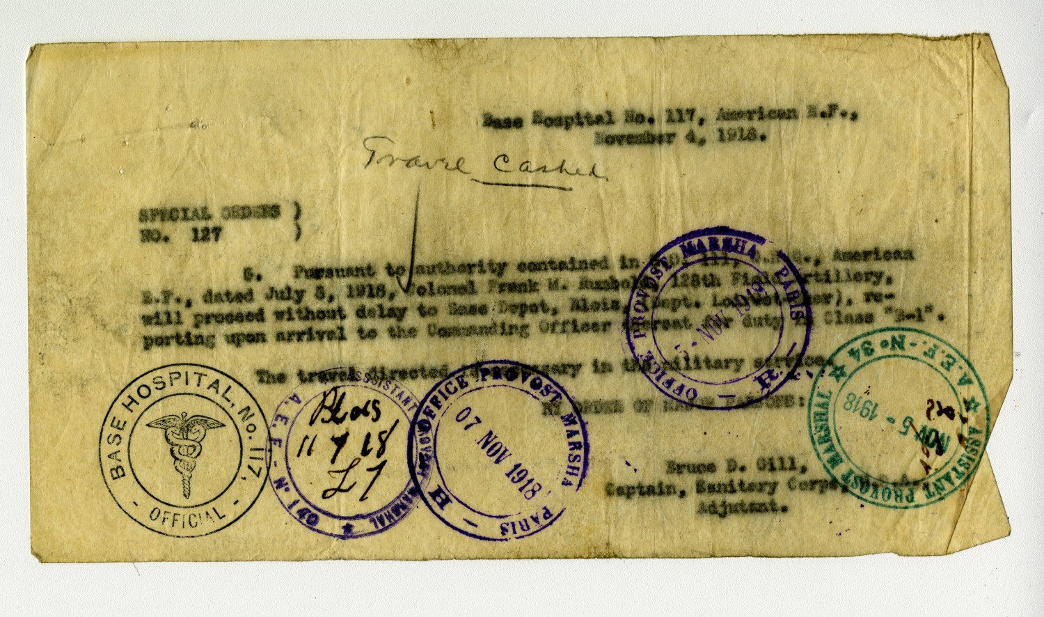 Bruce D. Gill Special Orders No. 127 - November 4, 1918