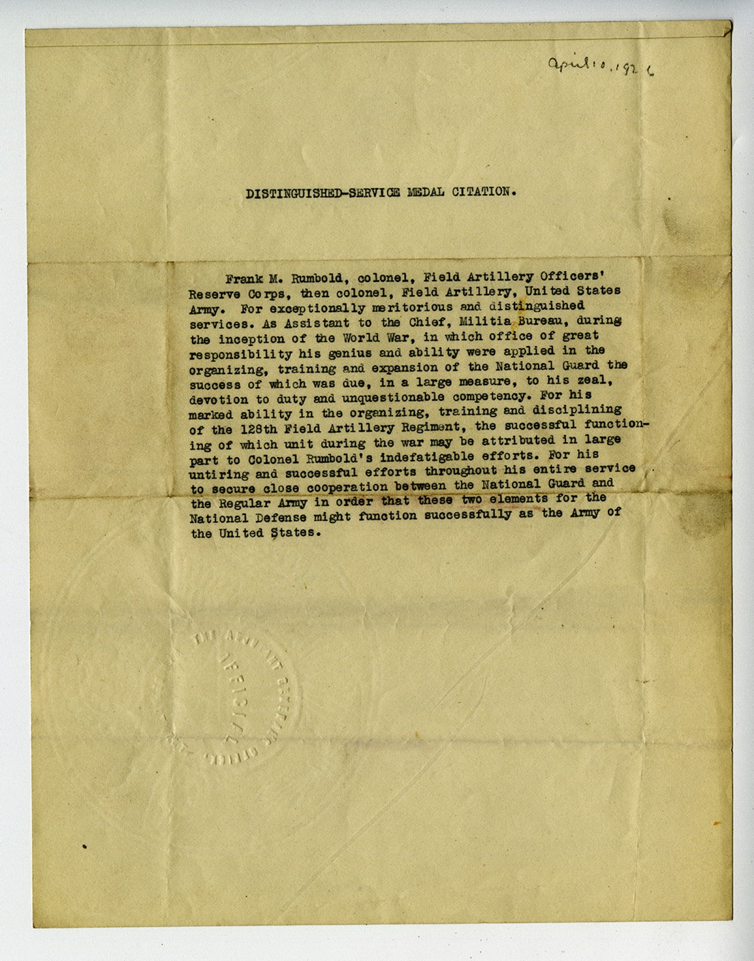 | Source | Unknown. Distinguished Service Medal Citation. 10 April 1926. Rumbold, Frank M., General Collection. A1331. Missouri History Museum, St. Louis, Missouri. |