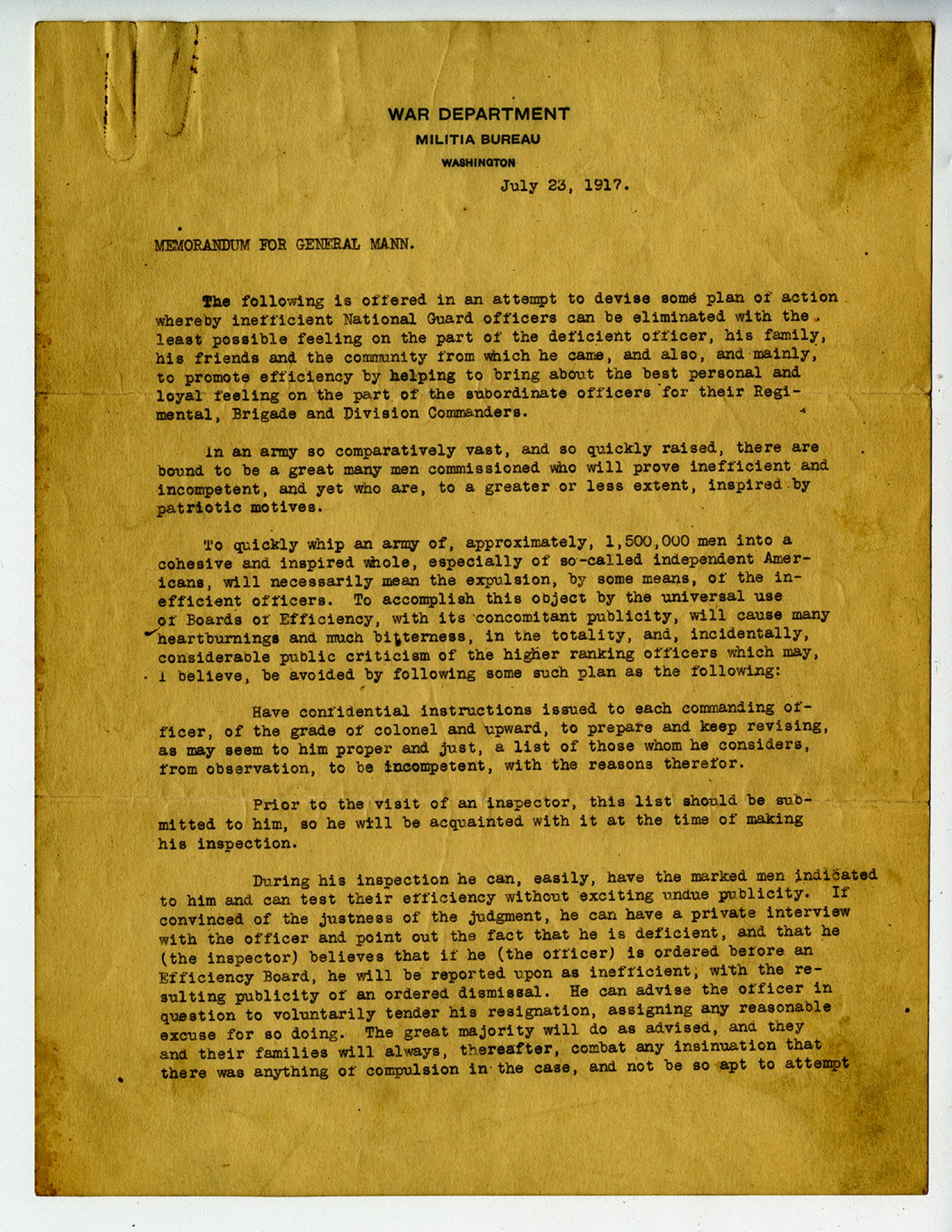 [War Department letterhead] July 23, 1917. MEMORANDUM FOR GENERAL MANN. The following is offered in an attempt to devise some plan of action whereby inefficient National Guard officers can be eliminated with the least possible feeling on the part of the deficient officer, his family, his friends and the community from which he came, and also, and mainly, to promote efficiency by helping to bring about the best personal and loyal feeling on the part of the subordinate officers for their Regimental, Brigade and Division Commanders. In an army so comparatively vast, and so quickly raised, there are bound to be a great many men commissioned who will prove inefficient and incompetent, and yet who are, to a greater or less extent, inspired by patriotic motives. To quickly whip an army of, approximately, 1,500,000 men into a cohesive and inspired whole, especially of so-called independent Americans, will necessarily mean the expulsion, by some means, of the inefficient officers. To accomplish this object by the universal use of Boards of Efficiency, with its concomitant publicity, will cause many heartburnings and much bitterness, in the totality, and, incidentally, considerable public criticism of the higher ranking officers which may, I believe, be avoided by following some such plan as the following: Have confidential instructions issued to each commanding officer, of the grade of colonel and upward, to prepare and keep revising, as may seem to him proper and just, a list of those whom he considers, from observation, to be incompetent, with the reasons therefor. Prior to the visit of an inspector, this list should be submitted to him, so he will be acquainted with it at the time of making his inspection. During his inspection he can, easily, have the marked men indicated to him and can test their efficiency without exciting undue publicity. If convinced of the justness of the judgment, he can have a private interview with the officer and point out the fact that he is deficient, and that he (the inspector) believes that if he (the officer) is ordered before an Efficiency Board, he will be reported upon as inefficient, with the resulting publicity of an ordered dismissal. He can advise the officer in question to voluntarily tender his resignation, assigning any reasonable excuse for so doing. The great majority will do as advised, and they and their families will always, thereafter, combat any insinuation that there was anything of compulsion in the case, and not be so apt to attempt