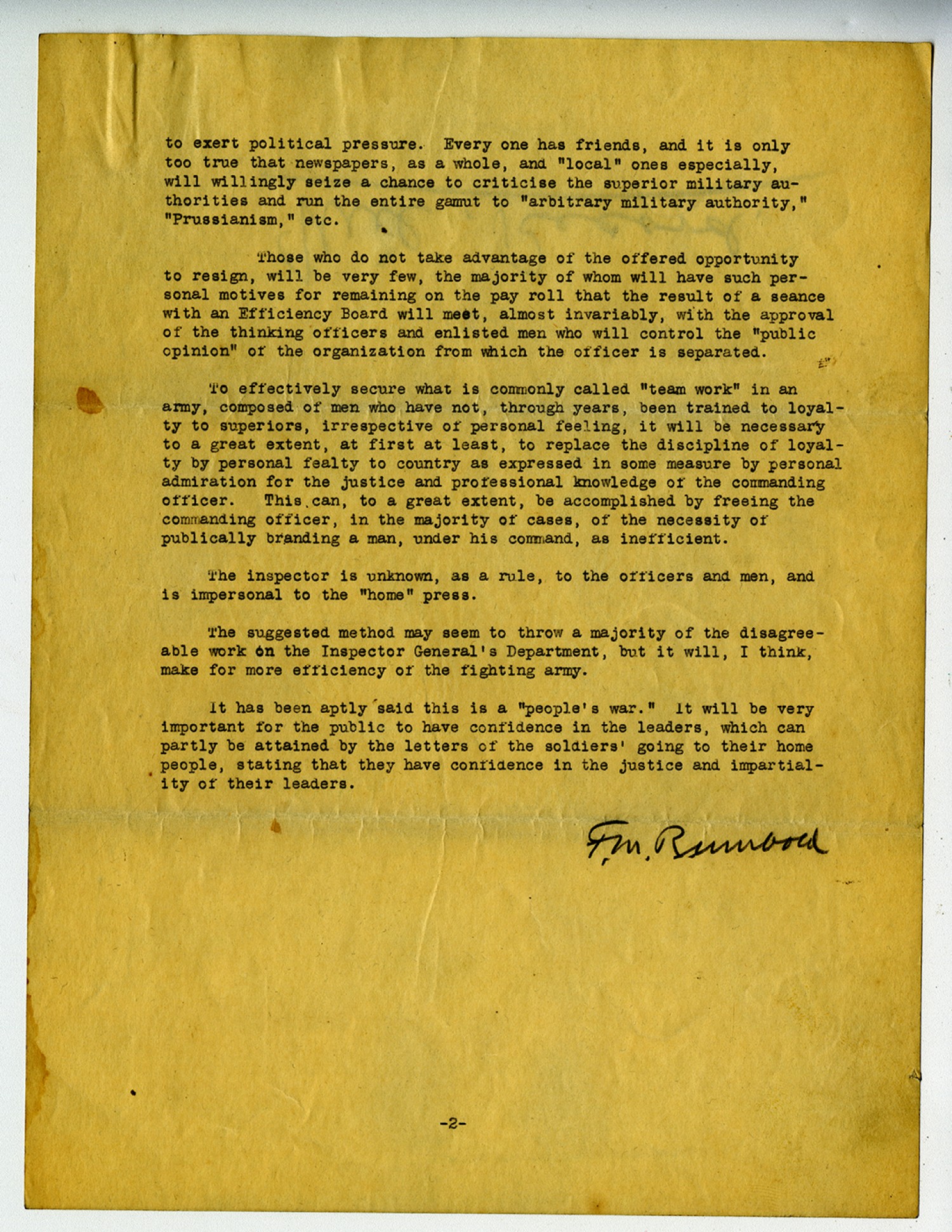 | Description | Memorandum to General Mann from Frank M. Rumbold making suggestions for the removal of insufficient National Guard officers within the growing army. Frank Meeker Rumbold served as Colonel of the 128th Field Artillery during World War I. He later served as Adjutant General of Missouri from 1925 to 1927. |