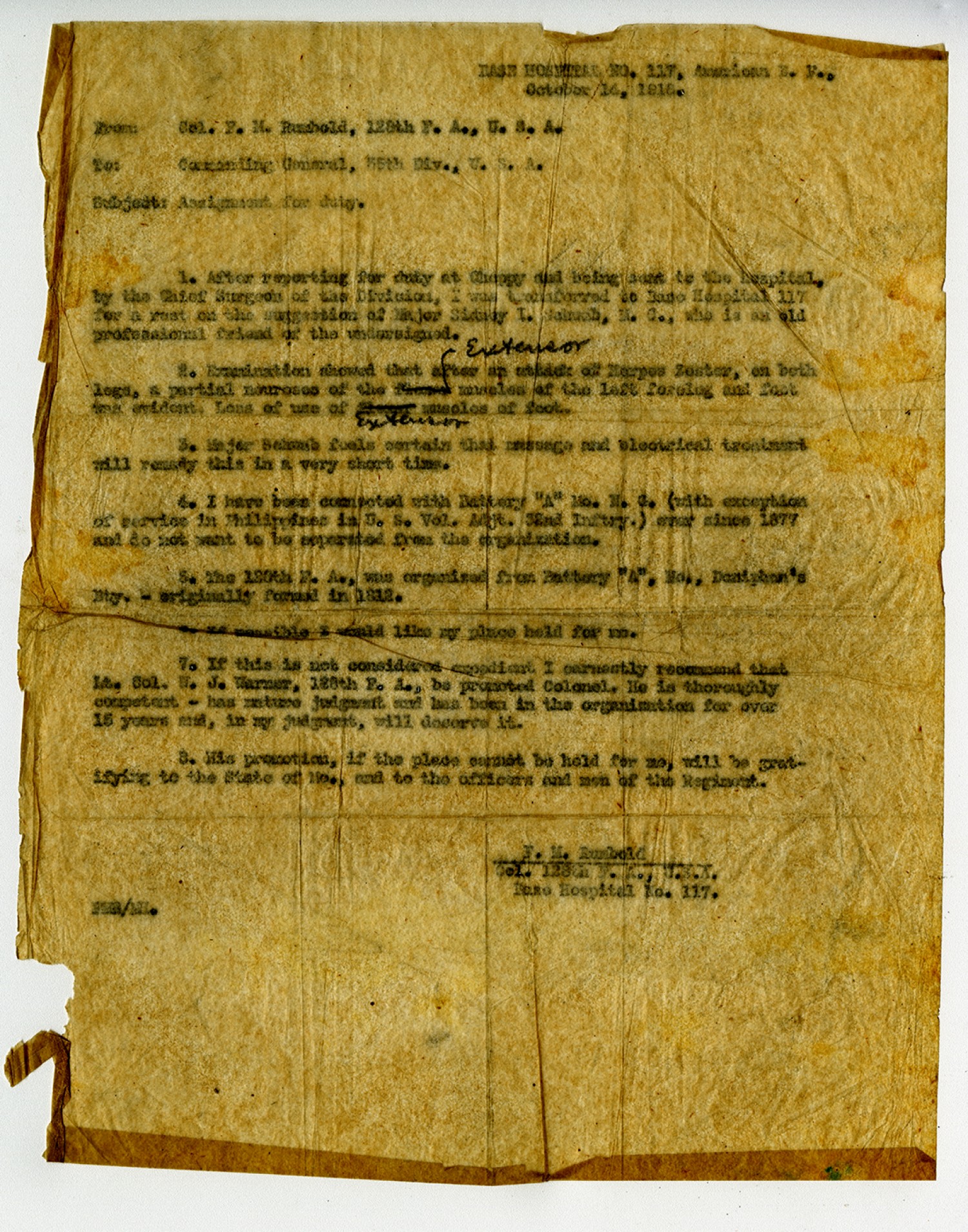BASE HOSPITAL NO. 117, American E.F., October 14, 1918. From: Col. F.M. Rumbold, 128th F.A., U.S.A. To: Commanding General, 35th Div., U.S.A. Subject: Assignment for duty. 1. After reporting for duty at Cheppy [ms illegible: 1 wd] being [ms illegible: 1 wd] in the hospital, by the Chief Surgeon of the Division, I was transferred to Base Hospital 117 for a rest on the suggestion of Major Sidney I. Schwab, M.C., who is an old professional friend of the undersigned. 2. Examination showed that after an attack of Merpes Zoster, on both legs, a partial neuroses of the exterior muscles of the left foreleg and foot was evident. Lens of use of exterior muscles of foot. 3. Major Schwab feels certain that massage and electrical treatment will remedy this in a very short time. 4. I have been connected with Battery